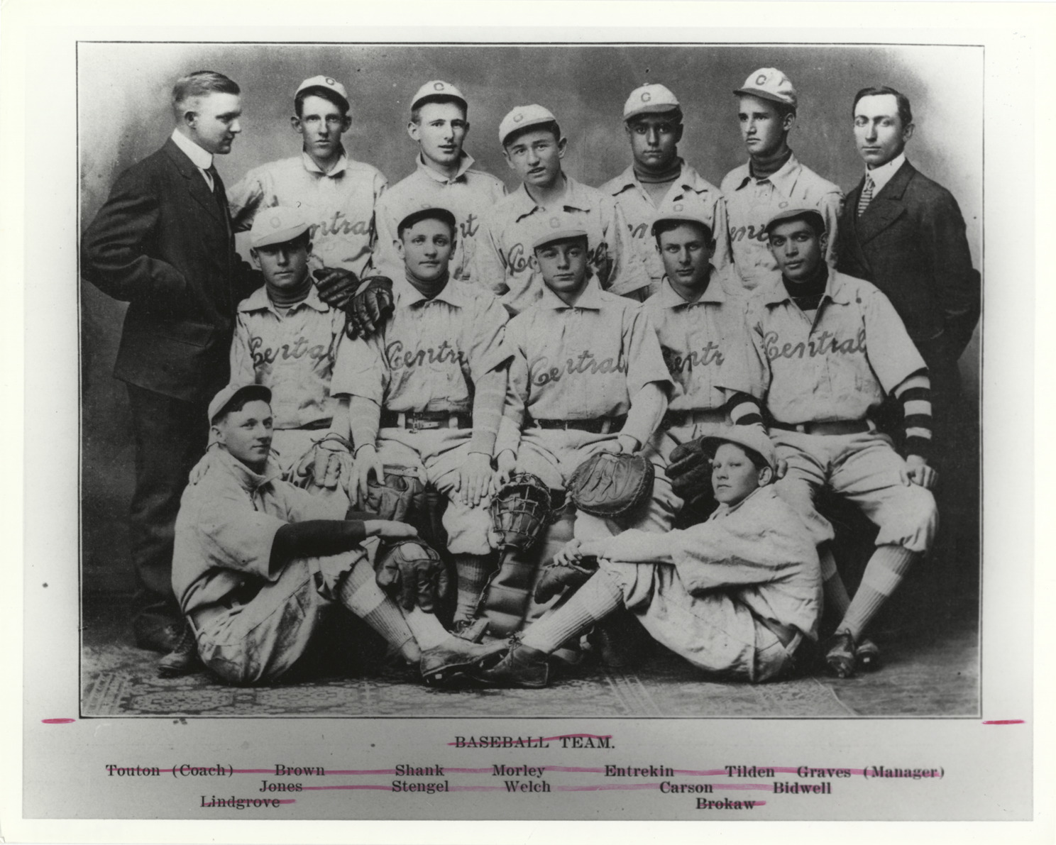 Portrait of Casey Stengel posing with his high school baseball team. Uniformed players sit in three rows; coaches stand on both sides of group. Uniforms have "Central" on jersey. Printed on front [crossed out]: "Baseball team. Touton (coach), Brown, Shank, Morley, Entrekin, Tilden, Graves (manager), Jones, Stengel, Welch, Carson, Bidwell, Lindgrove, Brokaw."