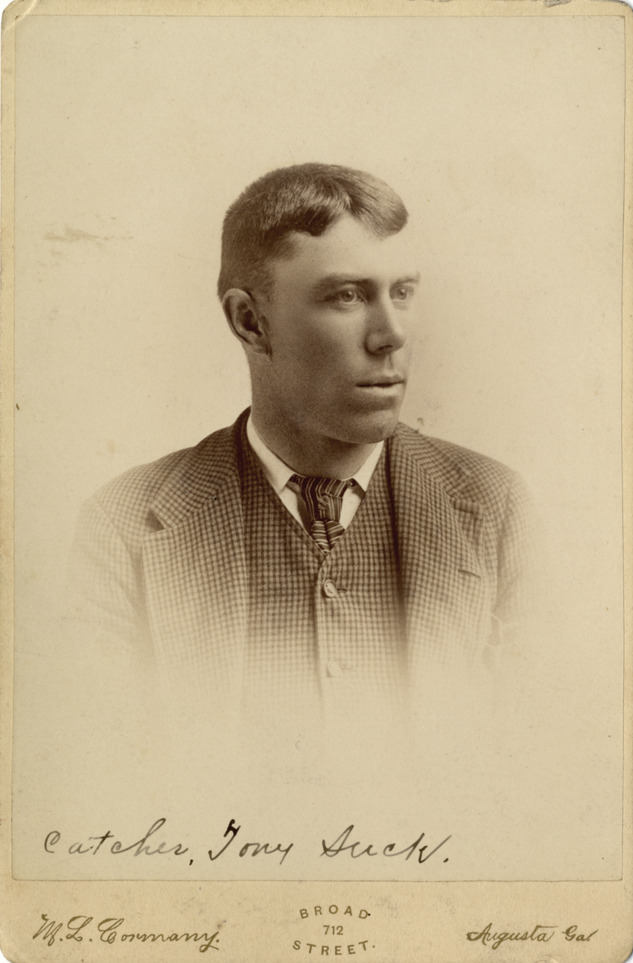 Portrait of catcher Tony Suck. Printed on front: "M.L. Cormany, 712 Broad Street, Augusta, Ga." Handwritten on front: "Catcher, Tony Suck."