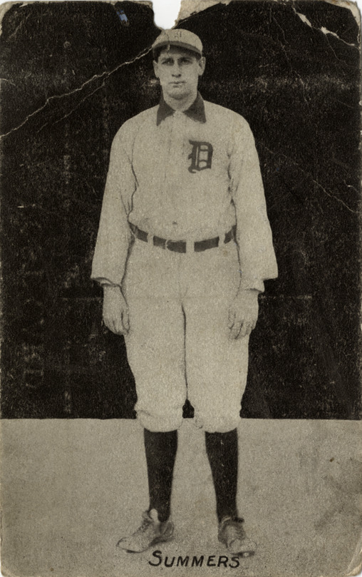 Portrait of Ed Summers, pitcher for the Detroit Tigers. Printed on front: "Summers." Printed on back: "Oren [sic] Edgar Summers, pitcher of the Detroit base ball club is a Hoosier by birth, residence and baseball education. His home is in Ladoga, Ind., and he gained his first large fame by pitching fine ball for the Indianapolis club in the American Association. He is 6 feet 1 inch in height, and weighs 168 pounds. He pitches with his right arm. Copyrighted and published by A.C. Dietsche, Detroit, Mich., 1907."