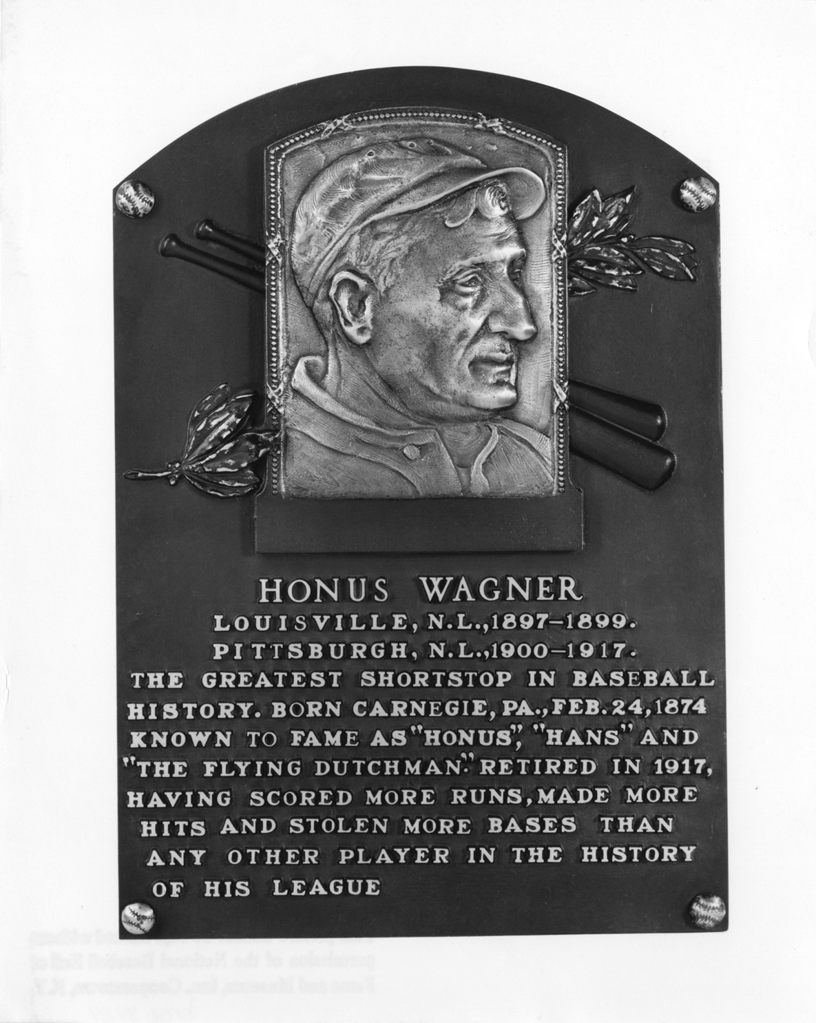 View of bronze relief plaque with portrait of baseball player Honus Wagner. Text on plaque reads: "Honus Wagner, Louisville, N.L., 1897-1899. Pittsburgh, N.L., 1900-1917. The greatest shortstop in baseball history. Born Carnegie, Pa., Feb. 24, 1874 known to fame as 'Honus', 'Hans' and 'The Flying Dutchman.' Retired in 1917, having scored more runs, made more hits and stolen more bases than any other player in the history of his league."