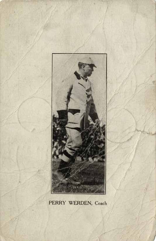 Favorite this☆ Perry Werden Description: Portrait of baseball coach Perry Werden. Printed on front: "Perry Werden, coach." Handwritten on back: "Your old friend Perry sends regards. D." Card is postmarked August 28, 1908. Details Resource ID: hr003977 Subject: Werden, Perry (Percival Wheritt), 1865-1934 Baseball coaches Photographic prints Postcards Date Issued: 1908 (year approximate) Format: 1 postcard ; 5.5 x 3.5 in. Member of: Ernie Harwell Sports Collection Filing Location: Photographs-Biography-Werden, Perry Rights: Physical rights are retained by DPL. Copyright is retained in accordance with U.S. copyright laws.
