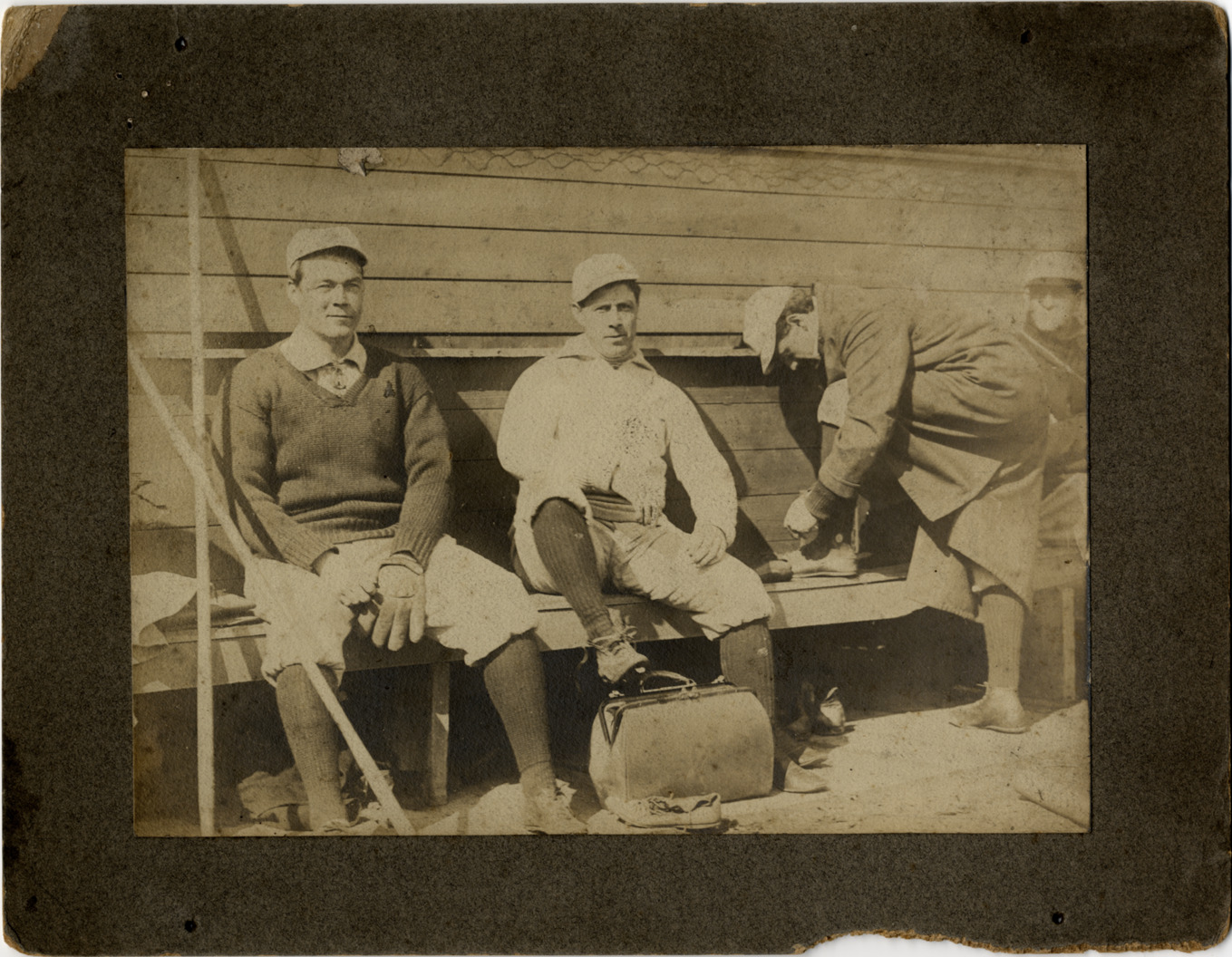 Favorite this☆ Baseball players on bench Description: Three baseball players sitting on bench. Another player wears overcoat and is tying shoe on bench. One player has foot on satchel. Details Resource ID: hr004057 Subject: Baseball players Baseball teams Photographic prints Date Issued: Unknown year Format: 1 photographic print mounted on mat board ; image 5.25 x 7 in. Member of: Ernie Harwell Sports Collection Filing Location: Photographs-Dug-Out Scenes Rights: Physical rights are retained by DPL. Copyright is retained in accordance with U.S. copyright laws.