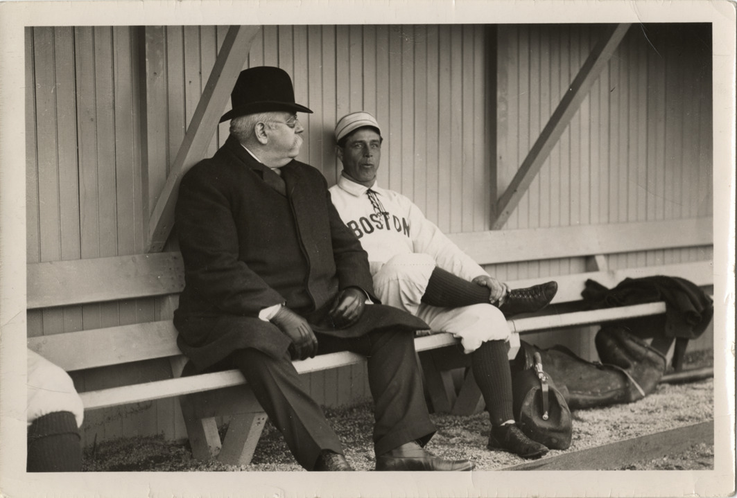 John L. Sullivan sitting on bench beside Boston Americans third baseman Jimmy Collins. Handwritten on back: "'John L.' Sullivan and Captain 'Jimmy' Collins, Boston American 'Red Sox.' Huntington Avenue base-ball grounds - Boston. 1904. From M.T. McGreevey (?). Pictorial history of base-ball, 1876-1918. Boston Public Library. Print Department. 'John L.' 46 years old in this photo!"