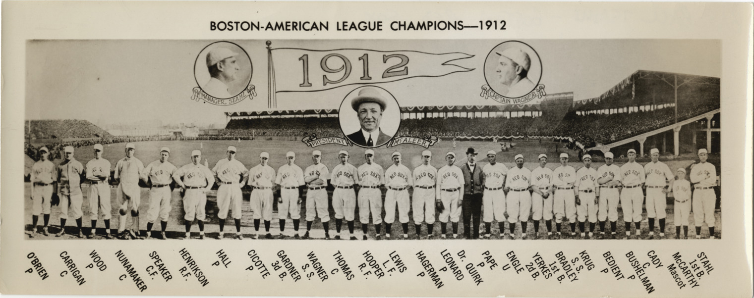 Group portrait of Boston Red Sox superimposed on field. Printed on front: "Boston-American League champions, 1912. Manager Stahl. Captain Wagner. President McAleer. O'Brien, P; Carrigan, C; Wood, P; Nunamaker, C; Speaker, CF; Henrikson, RF; Hall, P; Cicotte, P; Gardner, 3d B; Wagner, SS; Thomas, C; Hooper, RF; Lewis, RF; Hagerman, P; Leonard, P; Dr. Quirk; Pape, P; Engle, U; Yerkes, 2d B; Bradley, 1st B; Krug, SS; Bedient, P; Bushelman, P; Cady, C; McCarthy, mascot; Stahl, 1st B."