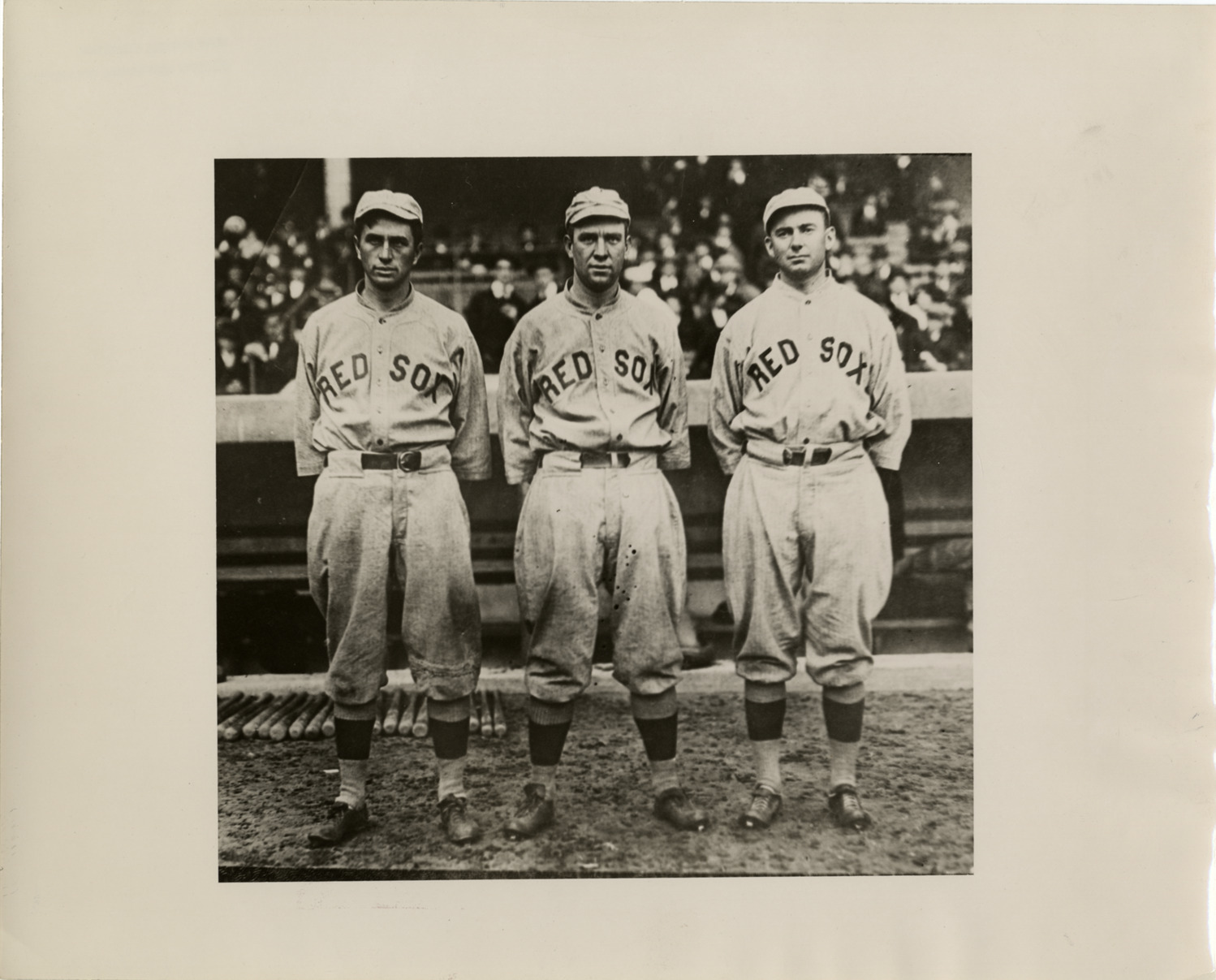 Favorite this☆ 1912 Boston Red Sox outfield Description: Group portrait of Boston Red Sox outfielders Harry Hooper, Tris Speaker, and Duffy Lewis on field. Printed on duplicate front: "Boston 'Red Sox' outfield, 1912. Left to right: Harry Hooper, R.F.; Tris Speaker, C.F.; George (Duffy) Lewis, L.F." Details Resource ID: hr004083 Subject: Hooper, Harry (Harry Bartholomew), 1887-1974 Speaker, Tris (Tristram E.), 1888-1958 Lewis, Duffy (George Edward), 1888-1979 Boston Red Sox (Baseball team) Baseball players--Massachusetts--Boston Photographic prints Date Issued: 1912 Format: 1 photographic print ; 8.25 x 10 in. Member of: Ernie Harwell Sports Collection Filing Location: Photographs-Teams-Boston Red Sox Rights: Physical rights are retained by DPL. Copyright is retained in accordance with U.S. copyright laws.