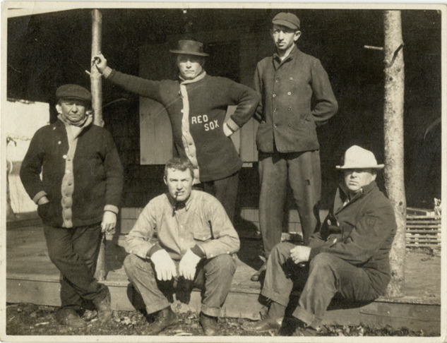 Favorite this☆ Bunny Madden and baseball players at rustic cabin Description: Bunny Madden with four other men on porch of rustic cabin. All wearing jackets or sweaters. Sweater on Madden reads "Red Sox." Handwritten on back: "1. Burns [Joe Burns?], 2. Madden [Bunny Madden], 3. [Lewiston Cox?], 4. [Carrigan?], 5. Leonard." Details Resource ID: hr004085 Subject: Madden, Bunny (Thomas Francis), 1882-1954 Baseball players Photographic prints Date Issued: 1910 (year approximate) Format: 1 photographic print ; 3.25 x 4.25 in. Member of: Ernie Harwell Sports Collection Filing Location: Photographs-Biography-Madden, Tom Rights: Physical rights are retained by DPL. Copyright is retained in accordance with U.S. copyright laws.