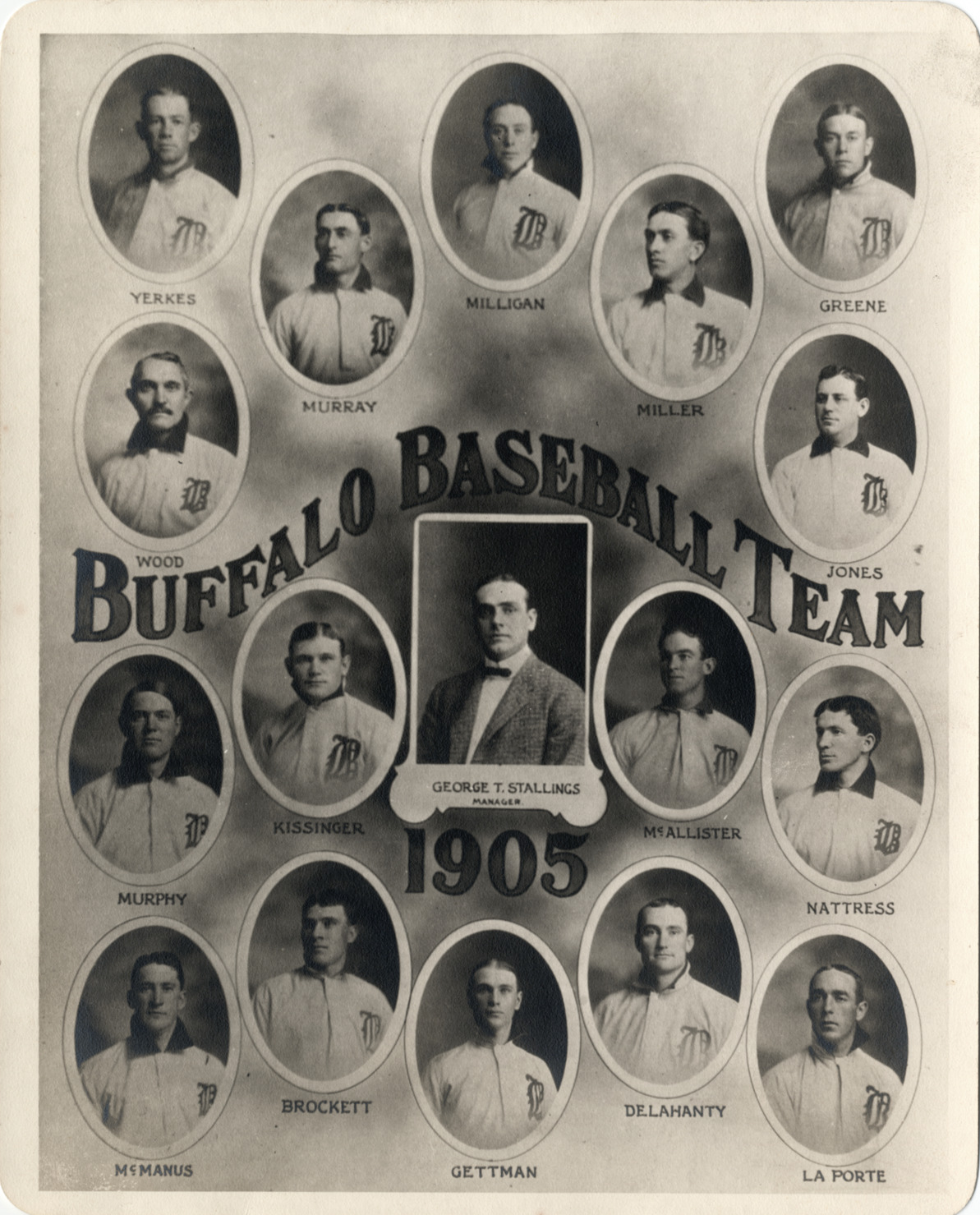 Favorite this☆ 1905 Buffalo baseball team Description: Individual portraits of 1905 Buffalo baseball team. Printed on front: "Buffalo baseball team, 1905. Yerkes; Milligan; Greene; Murray; Miller; Wood; Jones; Kissinger; George T. Stallings, manager; McAllister; Murphy; Nattress; Brockett; Delahanty; McManus; Gettman; La Porte." Details Resource ID: hr004098 Subject: Baseball teams--New York (State)--Buffalo Baseball players--New York (State)--Buffalo Photographic prints Date Issued: 1905 Format: 1 photographic print ; 10 x 8 in. Member of: Ernie Harwell Sports Collection Filing Location: Photographs-Teams-Buffalo Rights: Physical rights are retained by DPL. Copyright is retained in accordance with U.S. copyright laws.