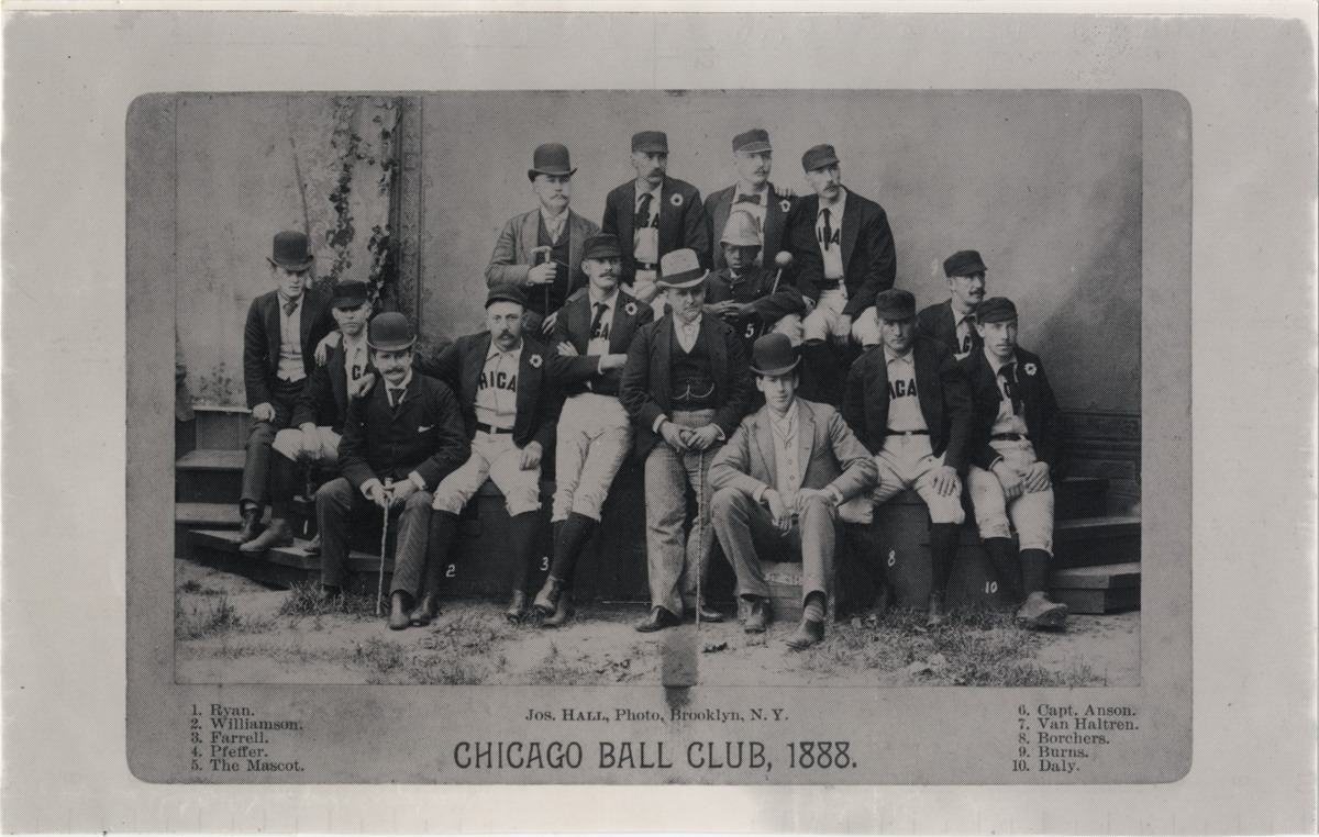 Group portrait of the 1888 Chicago White Stockings; uniformed baseball players pose on risers. Printed on front: "Jos. Hall, photo., Brooklyn, N.Y. Chicago ball club, 1888. 1. Ryan. 2. Williamson. 3. Farrell. 4. Pfeffer. 5. The mascot. 6. Capt. Anson. 7. Van Haltren. 8. Borchers. 9. Burns. 10. Daly."