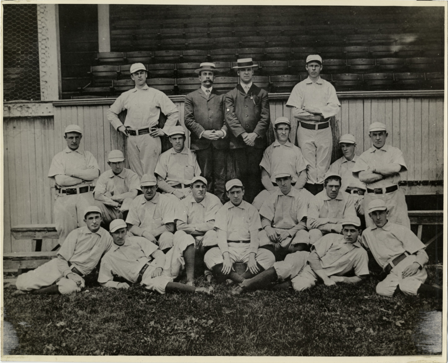 Group portrait of 1904 Chicago Cubs in front of stands. Typed on label on back: "Chicago Cubs, 1904. Left to right, top row: R.K. Wicker; F.G. Selee, manager; C.G. Williams, treas.; M. Brown. Third row: J. Slagle; J. McCarthy; J. Weimer; Frank Chance, captain; J. Evers; Doc. J. Casey. Second row: A. Smith; O. Williams; J. Tinker; Davey Jones; J. O'Neil [O'Neill]. First row: J. Kling; B. Briggs; C. Lundgren; F. Corridon." Handwritten on back: "Propery of Norman M. Rogers."