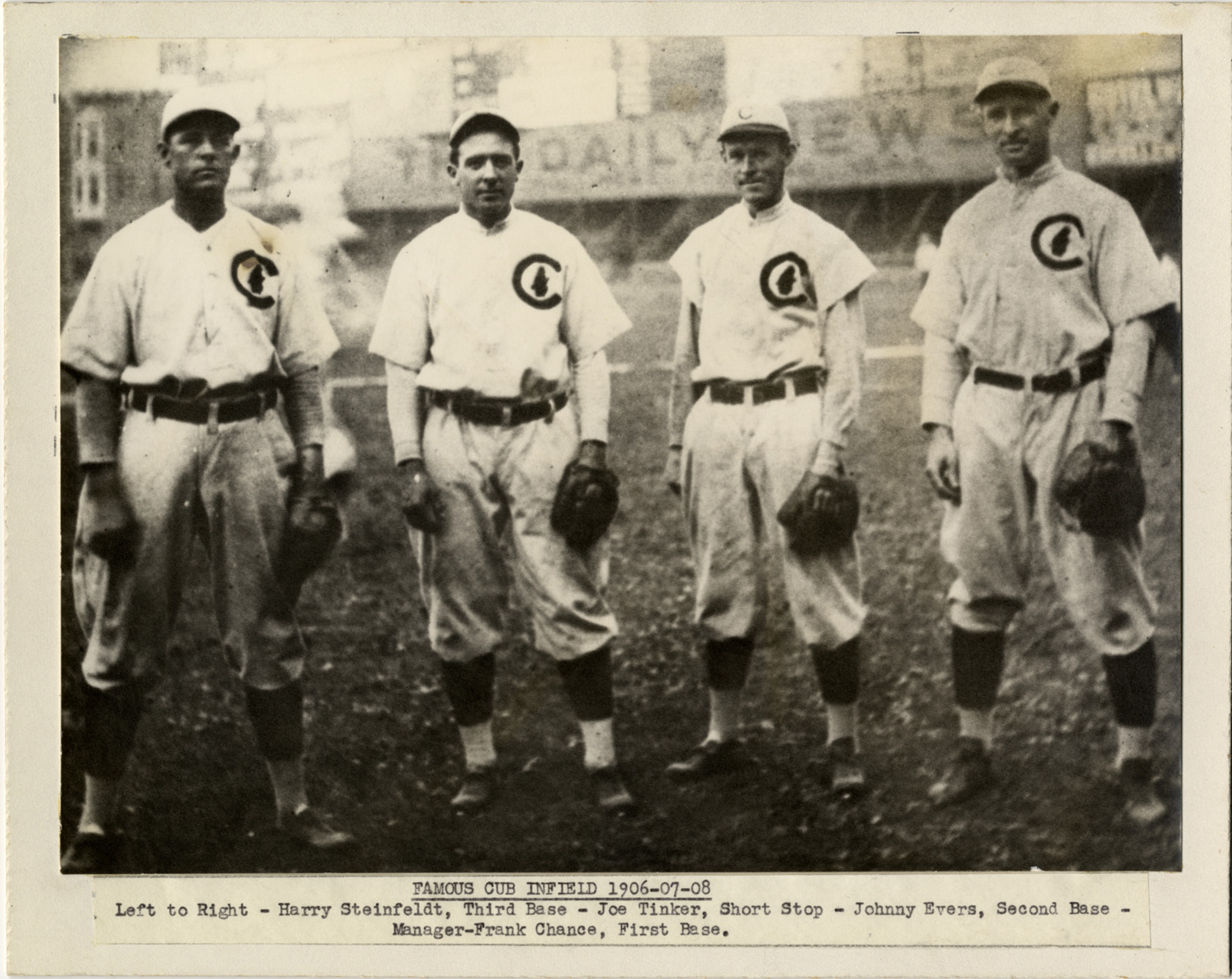 Group portrait of 1904 Chicago Cubs infielders on field. Typed on label on front: "Famous Chicago Cub infield 1906-07-08. Left to right: Harry Steinfeldt, third base; Joe Tinker, short stop; Johnny Evers, second base; manager Frank Chance, first base." Handwritten on back: "Steinfeldt, Tinker, Evers, Chance. Cubs infield, 1907, '08. World Series. R. Bak."