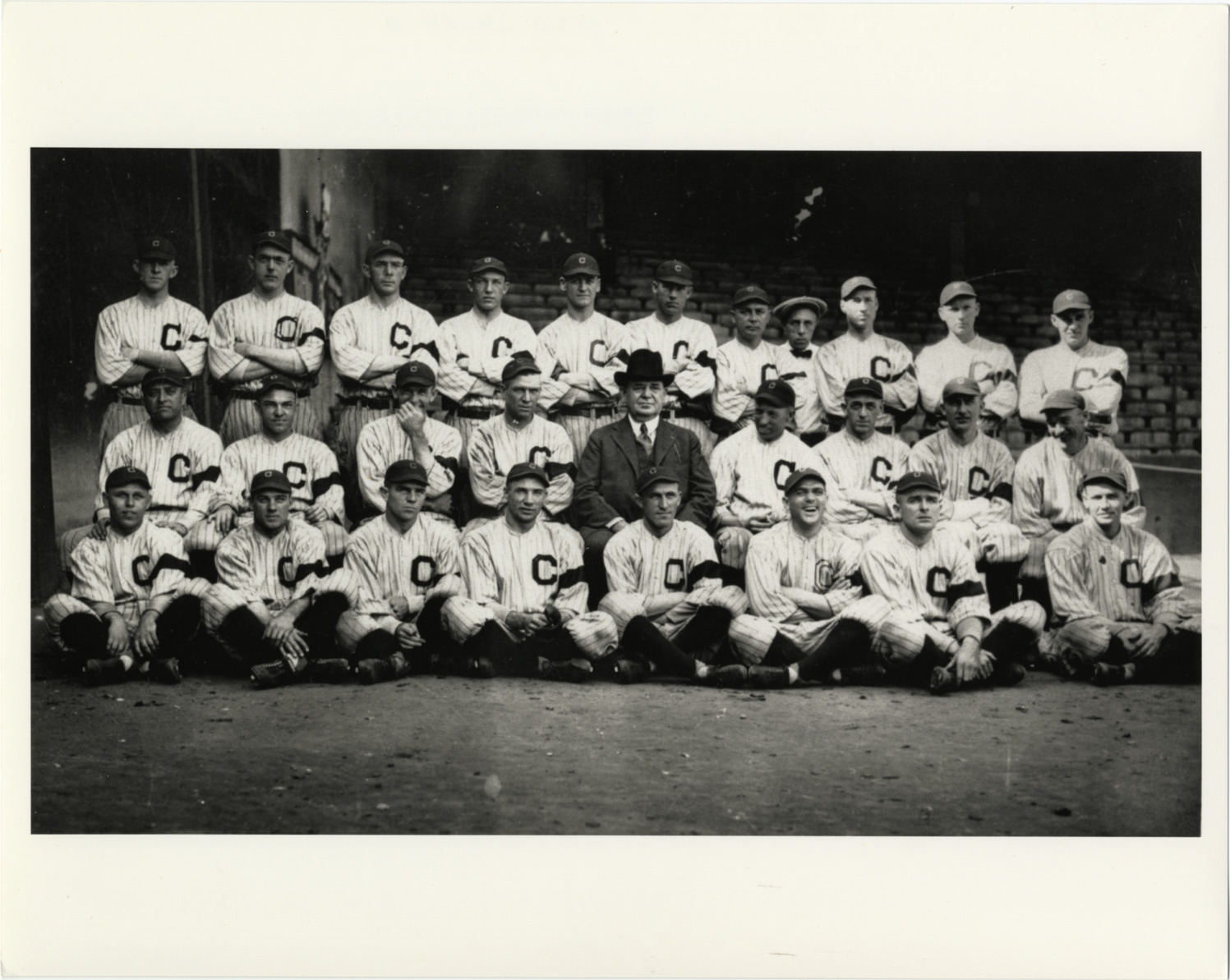 Favorite this☆ Cleveland Indians Description: Group portrait of the Cleveland Indians, posed in front of empty stands. Handwritten on back: "1920 Cleveland." Details Resource ID: hr004121 Subject: Cleveland Indians (Baseball team) Baseball players--Ohio--Cleveland Photographic prints Date Issued: 1920 Format: 1 photographic print ; 8 x 10 in. Member of: Ernie Harwell Sports Collection Filing Location: Photographs-Teams-Cleveland Indians Rights: Physical rights are retained by DPL. Copyright is retained in accordance with U.S. copyright laws.