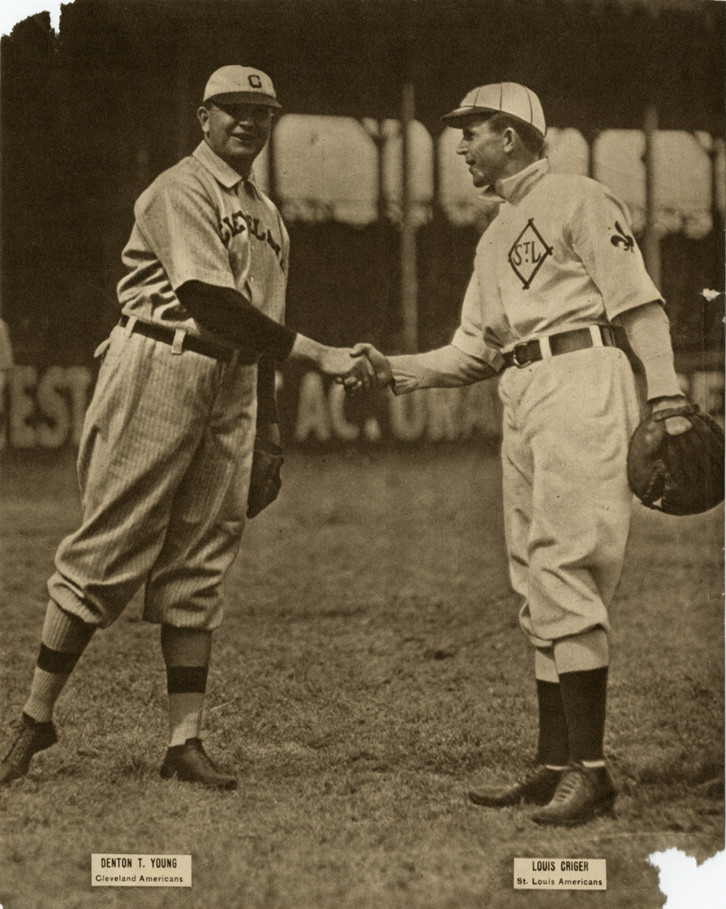 Favorite this☆ Cy Young and Lou Criger shaking hands Description: Cy Young and Lou Criger shaking hands on field. Printed on front: "Denton T. Young, Cleveland Americans. Louis Criger, St. Louis Americans." Details Resource ID: hr004125 Subject: Young, Cy, 1867-1955 Criger, Lou (Louis), 1872-1934 Cleveland Indians (Baseball team) St. Louis Browns (Baseball team) Photographic prints Date Issued: 1909 Format: 1 photographic print ; 9 x 7.25 in. Member of: Ernie Harwell Sports Collection Filing Location: Photographs-Teams-Combined Rights: Physical rights are retained by DPL. Copyright is retained in accordance with U.S. copyright laws.