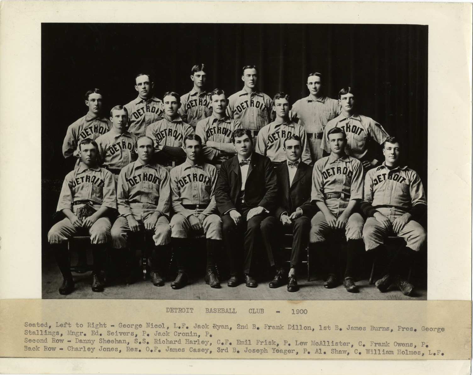 Group portrait of the Detroit baseball club, posed in studio, with president and manager. Typed on label on front: "Detroit baseball club, 1900. Seated, left to right: George Nicol, LF; Jack Ryan, 2nd B; Frank Dillon, 1st B; James Burns, pres.; George Stallings, mngr.; Ed. Seivers, P; Jack Cronin, P. Second row: Danny Sheehan, SS; Richard Harley, CF; Emil Frisk, P; Lew McAllister, C; Frank Owens, P. Back row: Charley Jones, res. OF; James Casey, 3rd B; Joseph Yeager, P; Al. Shaw, C; William Holmes, LF."
