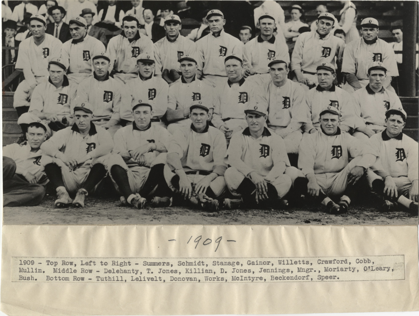Group portrait of Detroit Tigers posed on field in front of stands. Typed on label on front: "1909. Top row, left to right: Summers, Schmidt, Stanage, Gainor [Gainer], Willetts [Willett], Crawford, Cobb, Mullin. Middle row: Delehanty [Delahanty], T. Jones, Killian, D. Jones, Jennings (mngr.), Moriarty, O'Leary, Bush. Bottom row: Tuthill, Lelivelt, Donovan, Works, McIntyre, Beckendorf, Speer." Handwritten on front: "1909."