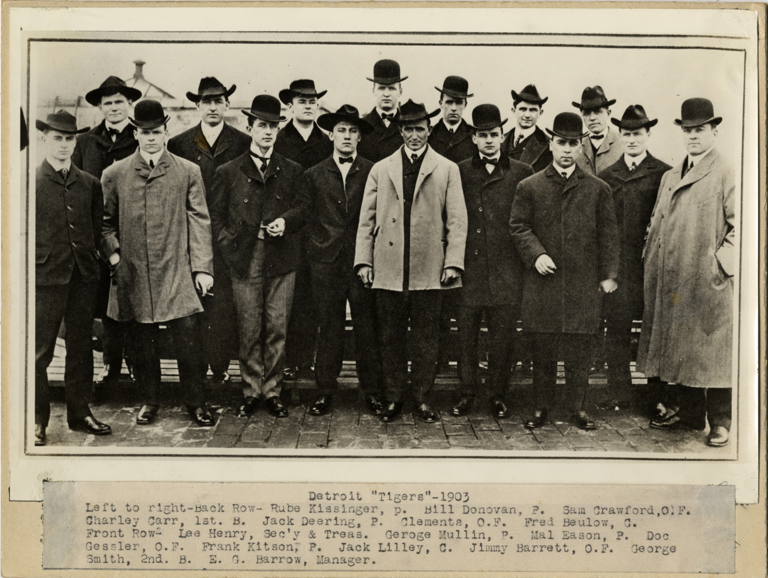 Group portrait of Detroit Tigers posed outside wearing topcoats and hats. Typed on label on front: "Detroit 'Tigers' 1903. Left to right, back row: Rube Kissinger [Kisinger], P; Bill Donovan, P; Sam Crawford, OF; Charley [Charlie] Carr, 1st B; Jack [John] Deering, P; Clements, OF; Fred Beulow [Fritz Buelow], C. Front row: Lee Henry, sec'y and treas.; Geroge [George] Mullin, P; Mal Eason, P.; Doc Gessler, OF; Frank Kitson, P; Jack Lilley, C; Jimmy Barrett, OF; George [Heinie] Smith, 2nd B; E.G. Barrow, manager." Printed on duplicate front: "Defenders of Detroit baseball prestige in 1903. In those days, when the American League was in its third years [sic], the Tigers played their home games in Bennett Park, now called Navin Field. The styles pictured were then the height of fashion, and Bill Donovan, second from the left, in the back row, was considered a Beau Brummel. [list of players' names and positions]." Printed on duplicate front: "The well-dressed player of 1903. And here they are, dressed to kill, but not to kill a base ball. The Tigers of 1903 in street attire. [list of players' names and positions] All the old timer pictures this week are from the files of The Detroit News, and consequently there are no prize awards. They will be resumed next Monday."