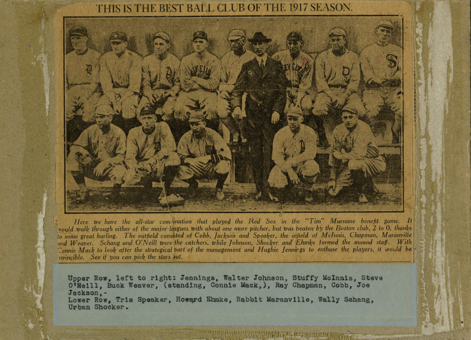 Group portrait of baseball team playing against the Red Sox at 'Tim' Murnane benefit game in 1917. Caption on clipping: "This is the best ball club of the 1917 season. Here we have the all-star combination that played the Red Sox in the 'Tim' Murnane benefit game. It would walk through either of the major leagues with about one more pitcher, but was beaten by the Boston club, 2 to 0, thanks to some great hurling. The outfield consisted of Cobb, Jackson and Speaker, the infield of McInnis, Chapman, Maranville and Weaver. Schang and O'Neill were the catchers, while Johnson, Shocker and Ehmke formed the mound staff. With Connie Mack to look after the strategical part of the management and Hughie Jennings to enthuse the players, it would be invincible. See if you can pick the stars out." Label on front: "Upper row, left to right: Jennings, Walter Johnson, Stuffy McInnis, Steve O'Neill, Buck Weaver, (standing, Connie Mack), Ray Chapman, Cobb, Joe Jackson. Lower row, Tris Speaker, Howard Ehmke, Rabbit Maranville, Wally Schang, Urban Shocker."