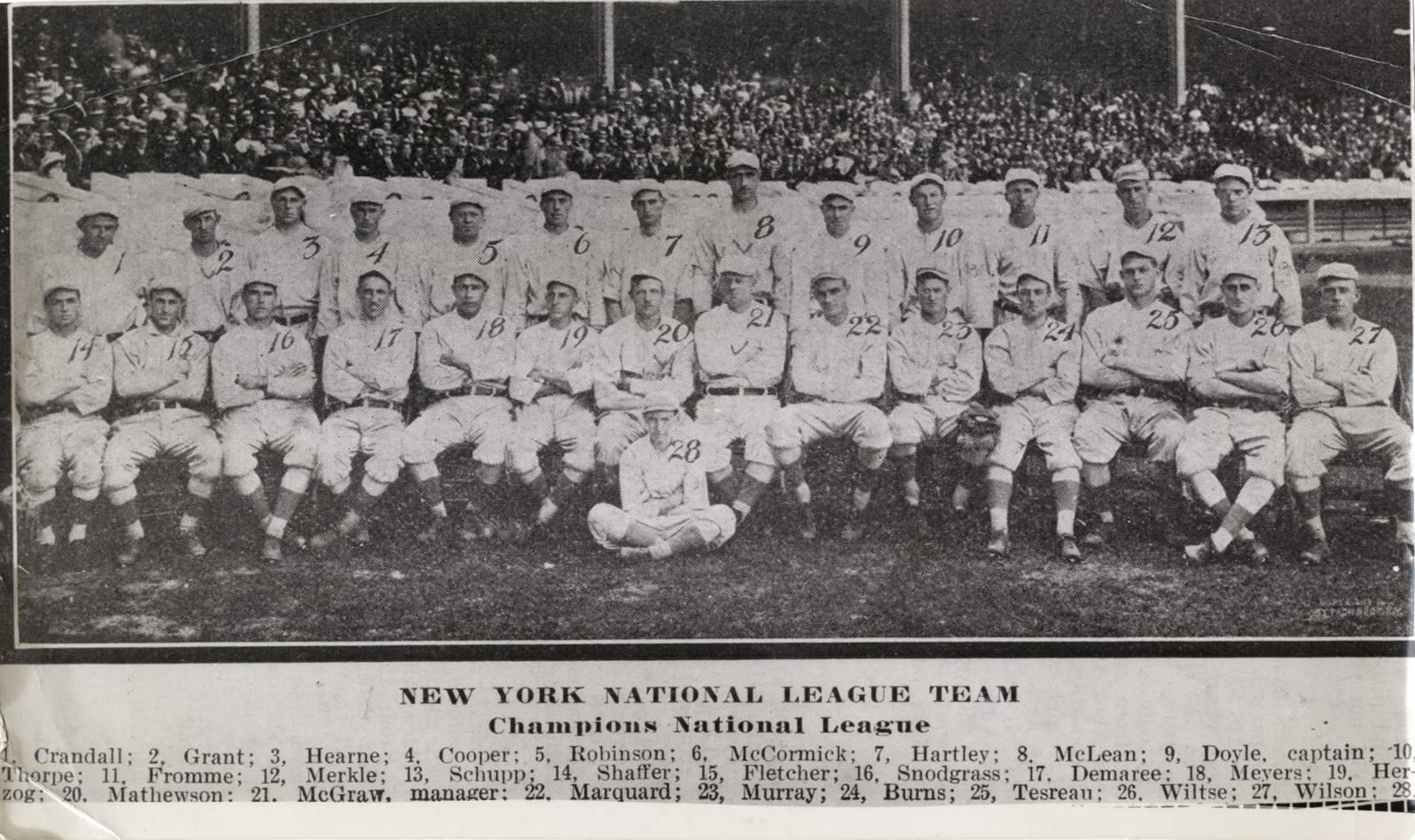 Group portrait of the New York Giants. Individual players identified with numbers. Printed on front: "New York National League team, champions National League. 1. Crandall; 2. Grant; 3. Hearne; 4. Cooper; 5. Robinson; 6. McCormick; 7. Hartley; 8. McLean; 9. Doyle, captain; 10. Thorpe; 11. Fromme; 12. Merkle; 13. Schupp; 14. Shaffer; 15. Fletcher; 16. Snodgrass; 17. Demaree; 18. Meyers; 19. Herzog; 20. Mathewson; 21. McGraw, manager; 22. Marquard; 23. Murray; 24. Burns; 25. Tesreau; 26. Wiltse; 27. Wilson; 28. [Hennessey, mascot.]"