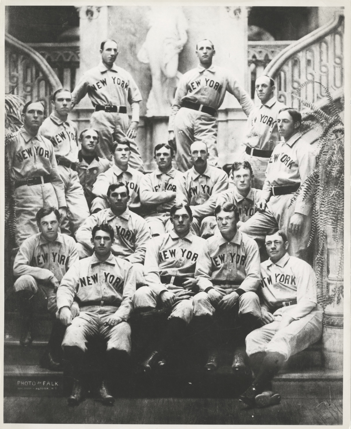 Group portrait of the 1903 New York Giants, posing on staircase. Printed on front: "Photo by Falk. Waldorf-Astoria, N.Y." Handwritten on back: "New York Giants of 1903. Team lineup. Red Ames, P.; Frank Bowerman, C.U.T.; Roger Bresnahan, O.F.; George Browne, O.F.; John Cronin, P.; John Dunn, 2 B.; Wm. Gilbert, 3 B.; Iron Man McGinnity, P.; Christy Mathewson, P.; Merters, McGann, Van Haltren, Warner."