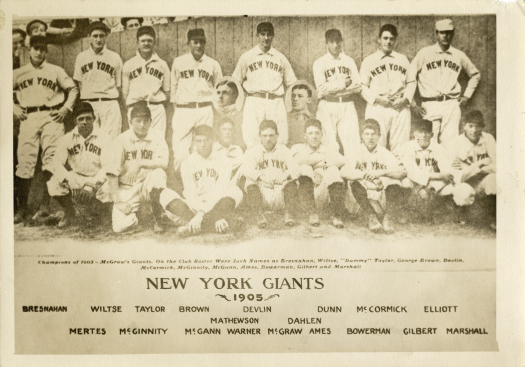 Group portrait of the 1905 New York Giants, posing in front of fence. Printed on front: "New York Giants, 1905. Bresnahan, Wiltse, Taylor, Brown, Devlin, Dunn, McCormick, Elliott, Mathewson, Dahlen, Mertes, McGinnity, McGann, Warner, McGraw, Ames, Bowerman, Gilbert, Marshall. Champions of 1905. McGraw's Giants, on the club roster were such names as Bresnahan, Wiltse, 'Dummy' Taylor, George Brown, Devlin, McCormick, McGinnity, McGann, Ames, Bowerman, Gilbert and Marshall." Stamped on back: "Reproduced by Burke & Brace Photo, 2638 N. Drake Avenue, Chicago 47, Illinois."