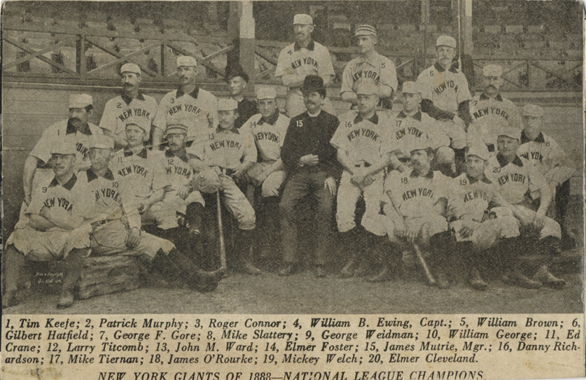 Group portrait of the 1888 New York Giants, posing in front of grandstand. Players identified with numbers. Printed on front: "New York Giants of 1888, National League champions. 1. Tim Keefe; 2. Patrick Murphy; 3. Roger Connor; 4. William B. Ewing, capt.; 5. William Brown; 6. Gilbert Hatfield; 7. George F. Gore; 8. Mike Slattery; 9. George Weidman; 10. William George; 11. Ed Crane; 12. Larry Titcomb; 13. John M. Ward; 14. Elmer Foster; 15. James Mutrie, mgr.; 16. Danny Richardson; 17. Mike Tiernan; 18. James O'Rourke; 19. Mickey Welch; 20. Elmer Cleveland."