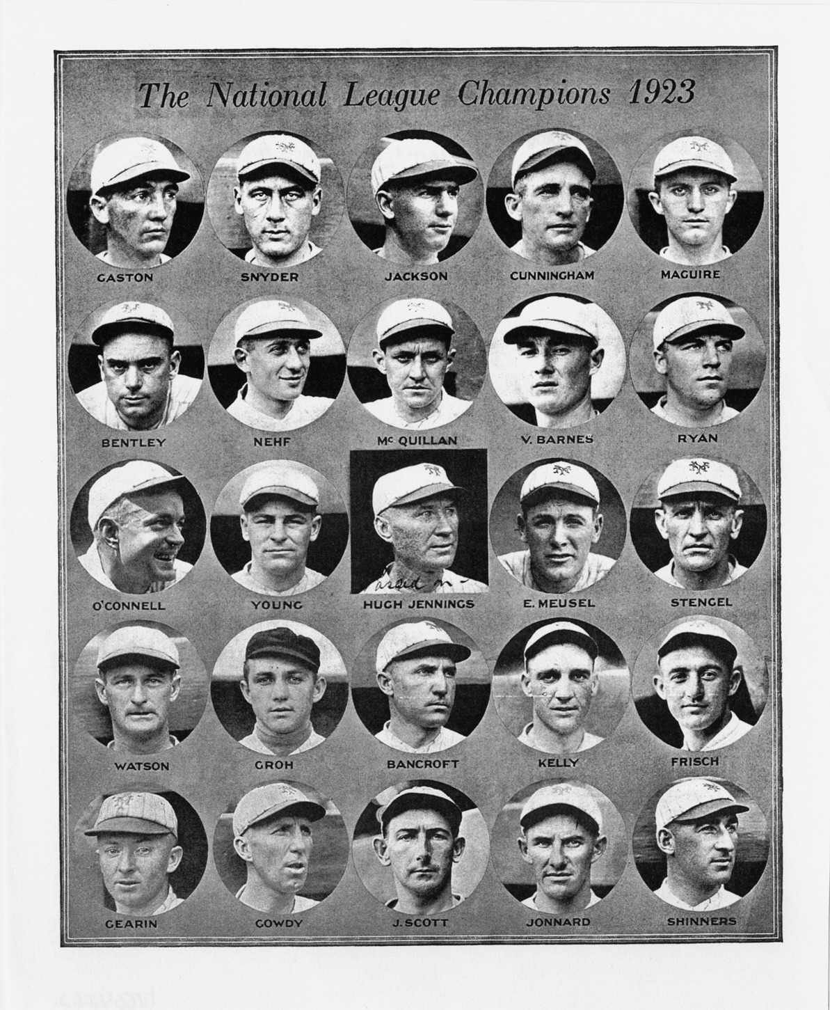 Individual portraits of the 1923 New York Giants. Printed on front: "The National League Champions 1923. Gaston, Snyder, Jackson, Cunningham, Maguire, Bentley, Nehf, McQuillan, V. Barnes, Ryan, O'Connell, Young, Hugh Jennings, E. Meusel, Stengel, Watson, Groh, Bancroft, Kelly, Frisch, Gearin, Gowdy, J. Scott, Jonnard, Shinners."