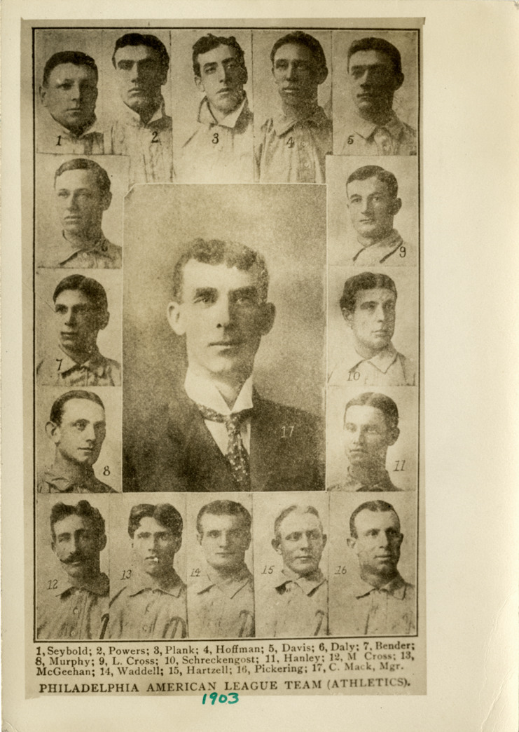 Individual portraits of the 1903 Philadelphia Athletics. Players are numbered. Printed on front: "Philadelphia American League team (Athletics). 1. Seybold; 2. Powers; 3. Plank; 4. Hoffman; 5. Davis; 6. Daly; 7. Bender; 8. Murphy; 9. L. Cross; 10. Schreckengost; 11. Hanley; 12. M. Cross; 13. McGeehan; 14. Waddell; 15. Hartzell; 16. Pickering; 17. C. Mack, mgr." Handwritten on front: "1903." Stamped on back: "Reproduced by Burke & Brace Photo, 2638 N. Drake Avenue, Chicago 47, Illinois."