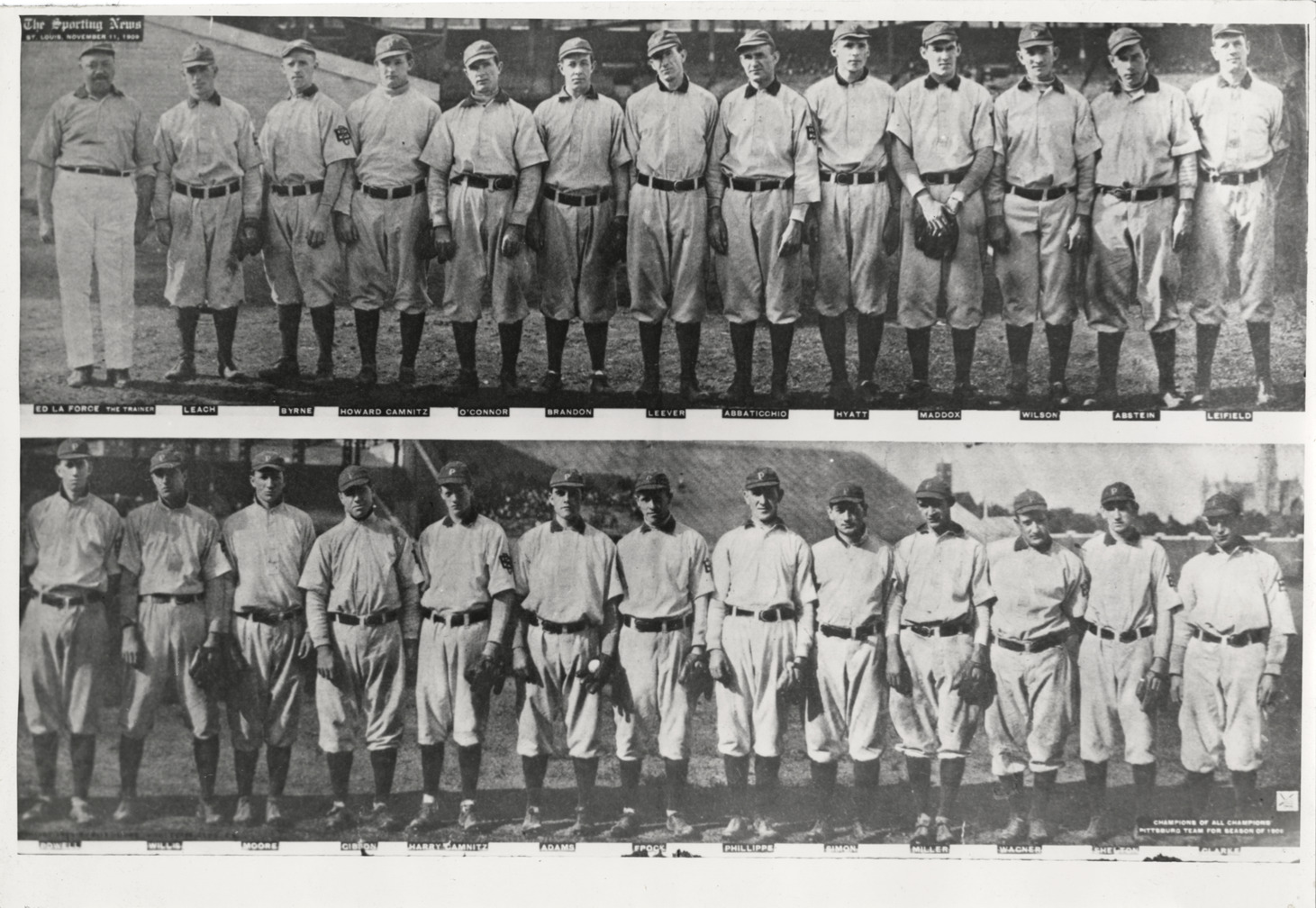 Two group portraits of the 1909 Pittsburgh Pirates. Printed on front: "The Sporting News, St. Louis, November 11, 1909. Ed La Force, the trainer. Leach, Byrne, Howard Camnitz, O'Connor, Brandon, Leever, Abbaticchio, Hyatt, Maddox, Wilson, Abstein, Leifeld. Powell, Willis, Moore, Gibbon, Harry Camnitz, Adams, Frock, Phillippe, Simon, Miller, Wagner, Shelton, Clarke. Champions of all champions. Pittsburgh team for the season of 1909." Typed on back: "1909 Pittsburgh Pirates."