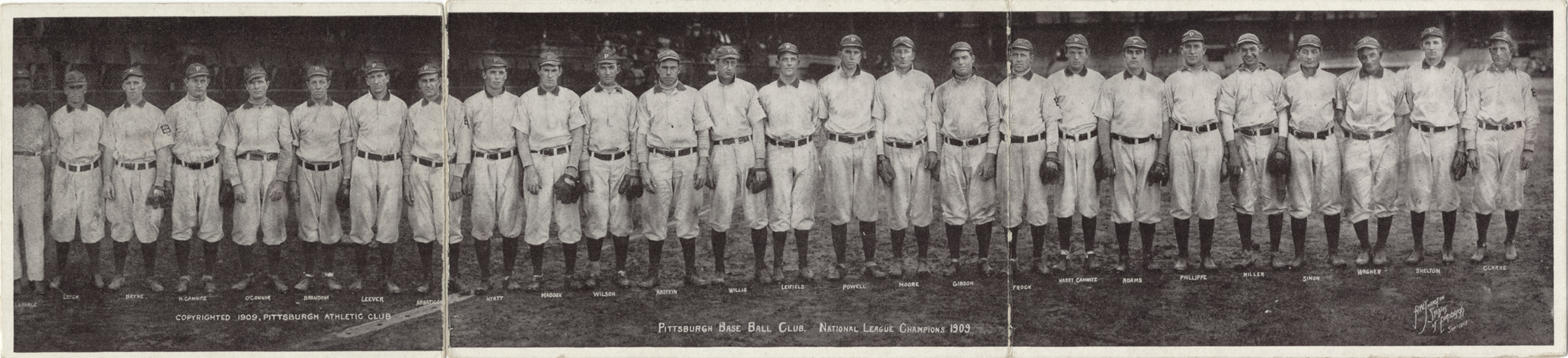 Group portrait of the 1909 Pittsburgh Pirates. Printed on front: "Pittsburgh Base Ball Club. National League champions 1909. Copyrighted 1909, Pittsburgh Athletic Club. R.W. Johnston Studios of Pittsburgh. Sep. 1909. LaForce, Leach, Bryne [sic], H. Camnitz, O'Connor, Brandom, Leever, Abbaticchio, Hyatt, Maddox, Wilson, Abstein, Willis, Leifield, Powell, Moore, Gibson, Frock, Harry Camnitz, Adams, Phillippe, Miller, Simon, Wagner, Shelton, Clarke." Printed on back: "Published by the R.W. Johnston Studios, Pittsburgh." Handwritten on back: "Ee Yah, Wee Ah. Have a good look at the new Worlds Champions. How do you like our Kiddo Babe Adams. Oh you are a dream. Well well a shutout ... Louie. What a headache and Jenning's last hope has vanished poor boy ... Hughey Jennings has a nice disposich [sic] and he only did wish that the Tiger Bunch would the World's Championship land there he would be ready to quit but not yet not ... "