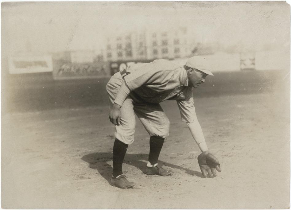 Baseball player reaching for ground ball