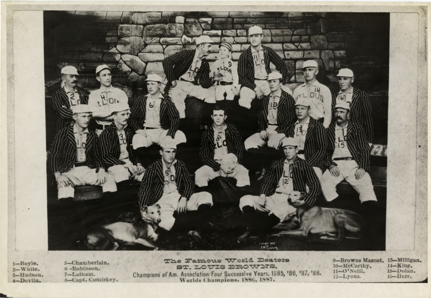 Group portrait of St. Louis Browns with boy and two dogs. Number written on each person. Printed on front: "Copyright [1888?] F.W. Ewing. The famous world beaters, St. Louis Browns. Champions of Am. Association four successive years, 1885, '86, '87, '88. Worlds champions 1886, 1887. 1. Boyle; 2. White; 3. Hudson; 4. Devlin; 5. Chamberlain; 6. Robinson; 7. Latham; 8. Capt. Comiskey; 9. Browns mascot; 10. McCarthy; 11. O'Neill; 12. Lyons; 13. Milligan; 14. King; 15. Dolan; 16. Herr." Printed on duplicate front: "St. Louis Browns, 1888. Top row, left to right: Latham, mascot, O'Neil [O'Neill]. Second row: White, Devlin, Robinson, McCarthy, King, Herr. Third row: Boyle, Hudson, Captain Comiskey, Milligan, Dolan. Bottom row: Chamberlain, Lyons."
