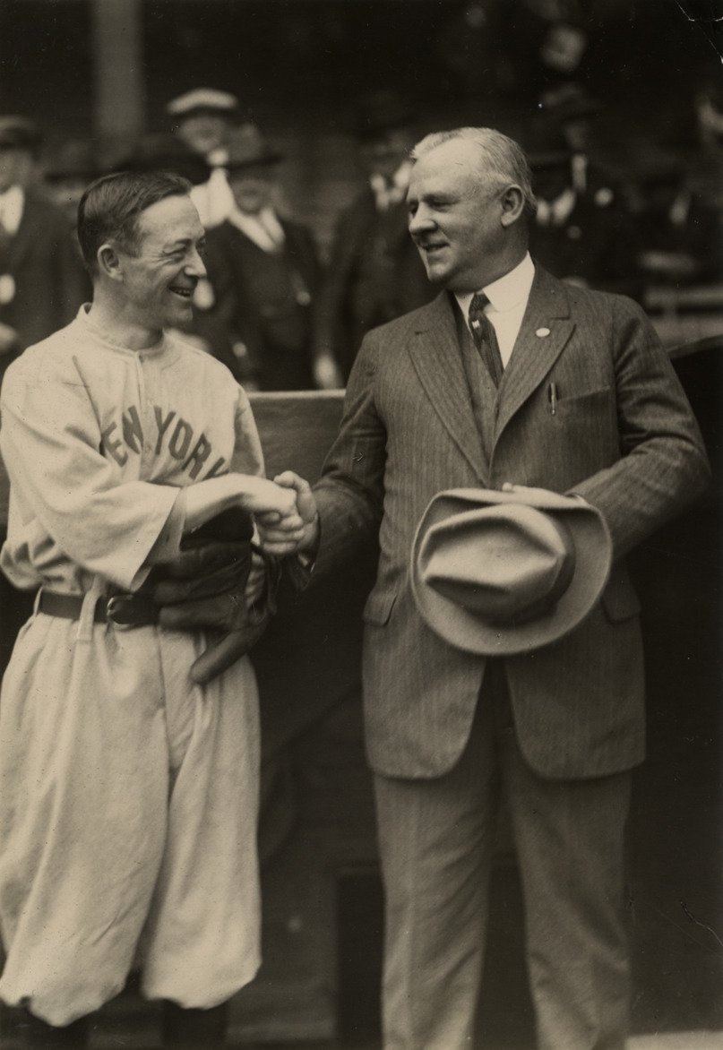 Favorite this☆ Miller Huggins and John McGraw at 1922 World Series Description: Miller Huggins and John McGraw shaking hands. Handwritten on back: "Huggins and McGraw. Before first game, World Series, 1922." Details Resource ID: hr004247 Subject: Huggins, Miller James, 1879-1929 McGraw, John Joseph, 1873-1934 World Series (Baseball) (1922) New York Giants (Baseball team) New York Yankees (Baseball team) Photographic prints Date Issued: 1922-10 Format: 1 photographic print ; 8 x 5.5 in. Member of: Ernie Harwell Sports Collection Filing Location: Photographs-World Series, 1922 Rights: Physical rights are retained by DPL. Copyright is retained in accordance with U.S. copyright laws.