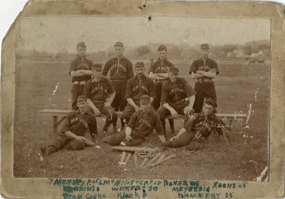 Favorite this☆ Vicksburg, Mississippi, baseball team Description: Group portrait of Vicksburg baseball team posed on field. Handwritten on front: "Meaney, P; McAllister, P, LF; Bonr, [RF?]; Koons, LF; Hawkins, [3?]; [Weckert?], 2B; Meyers, 1B; [?] Cooke; Klack, P; Bannert, SS." Handwritten on back: "Vicksburg, 1893. Mississippi State League champions, 1893." Details Resource ID: hr004273 Subject: Baseball teams--Mississippi--Vicksburg Baseball players--Mississippi--Vicksburg Photographic prints Date Issued: 1893 Format: 1 photographic print mounted on mat board ; image 3.75 x 5.75 in. Member of: Ernie Harwell Sports Collection Filing Location: Photographs-Teams-Vicksburg, Mississippi Rights: Physical rights are retained by DPL. Copyright is retained in accordance with U.S. copyright laws.