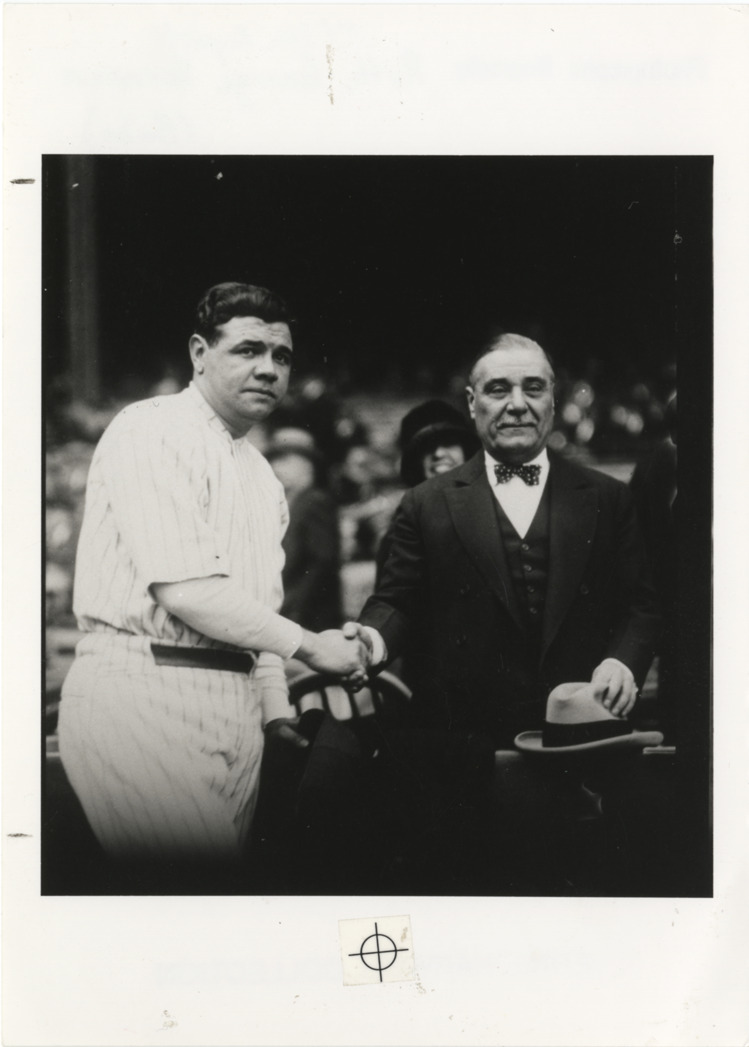 New York Yankees pitcher Babe Ruth shaking hands with Yankees owner Jake Ruppert. Handwritten on back: "Ruth, George Herman (Babe), w/ Jake Rupert [sic]."