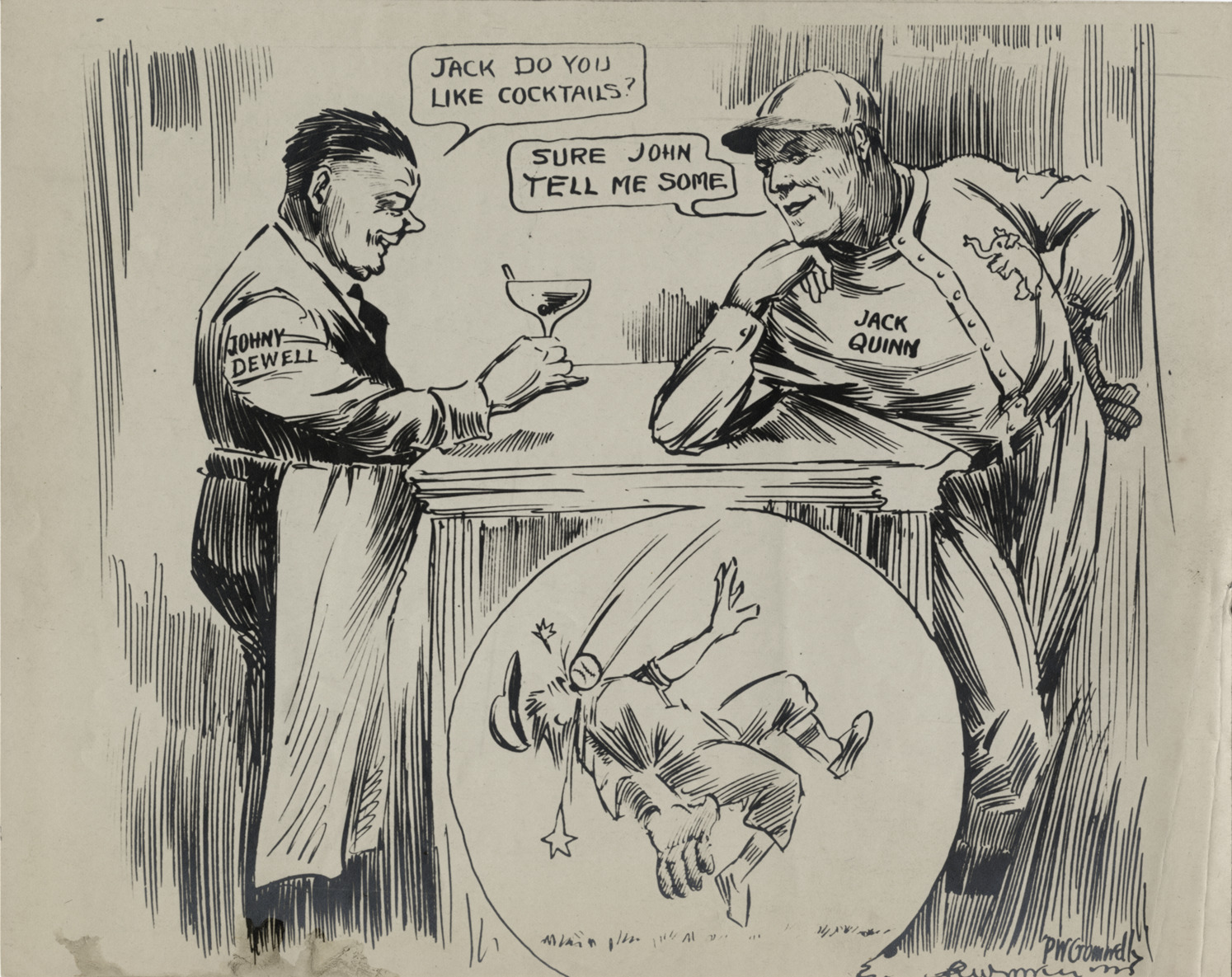Cartoon depicting Philadelphia Athletics baseball player Jack Quinn conversing with bartender identified as Johny Dewell. Bartender asks: "Jack, do you like cocktails?" Quinn replies: "Sure, John, tell me some." Inset drawing of player being hit in the face with a baseball. Artwork is signed: "P.W. Gromwell."