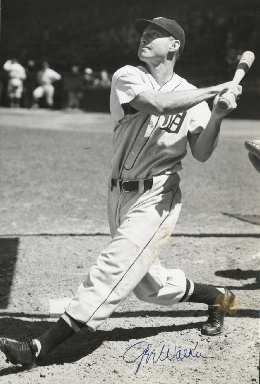 Portrait of Gee Walker, baseball player for the Detroit Tigers, swinging a baseball bat. Typed on label: "Gerald Walker, 1931-37." Handwritten on front: "Gee Walker." Dates on label reflect affiliation with Detroit Tigers.