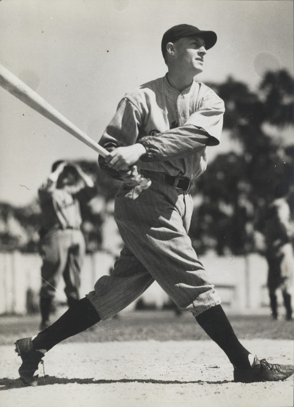 Portrait of Jo-Jo White, baseball player for the Detroit Tigers, swinging a baseball bat. Typed on label: "Joyner White, 1932-38." Dates on label reflect affiliation with Detroit Tigers.