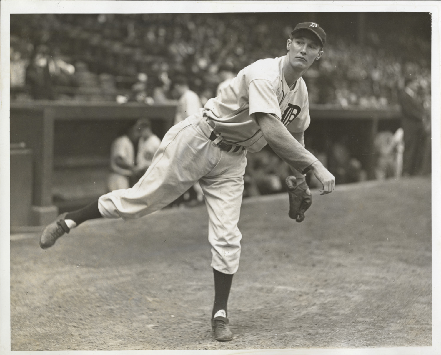 Portrait of Floyd Giebell, pitcher for the Detroit Tigers. Typed on label: "Floyd Giebell, 1939-." Dates on label reflect affiliation with Detroit Tigers.