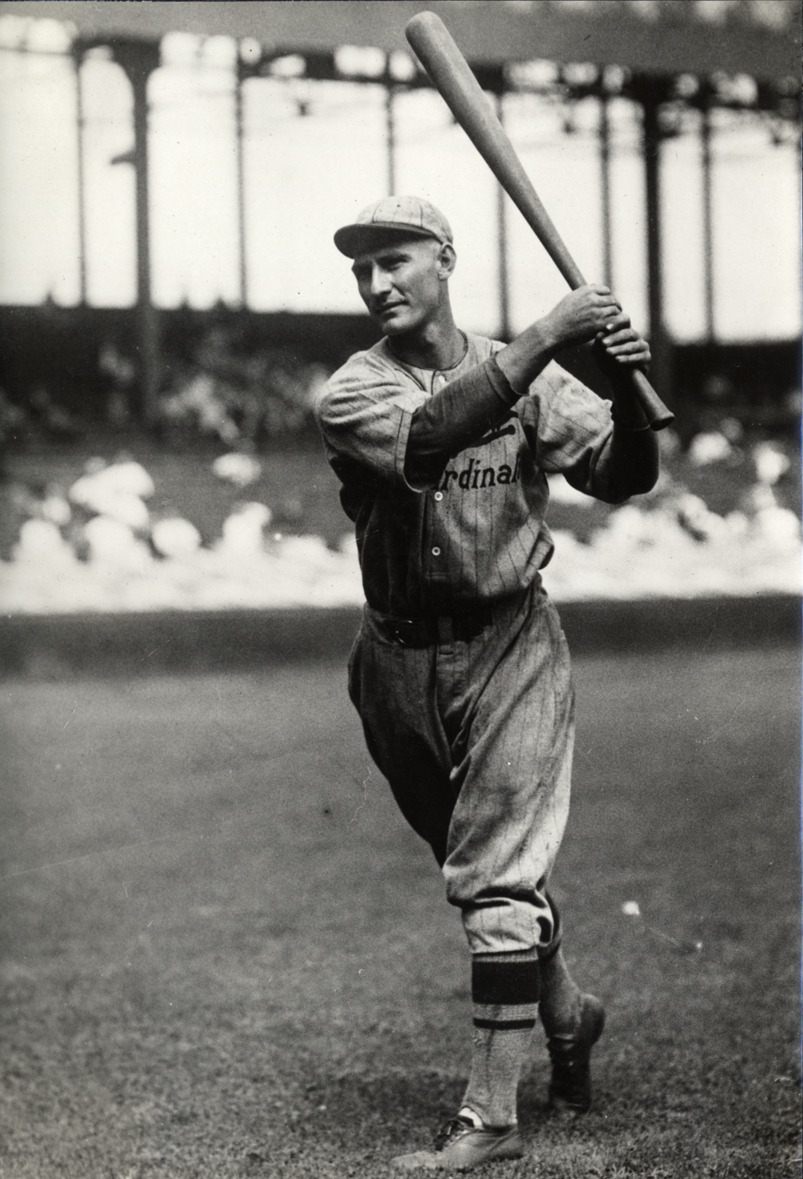 Portrait of Wattie Holm, baseball player for the St. Louis Cardinals, holding a baseball bat. Typed on label: "Roscoe A. Holm, Cardinals, 1926."