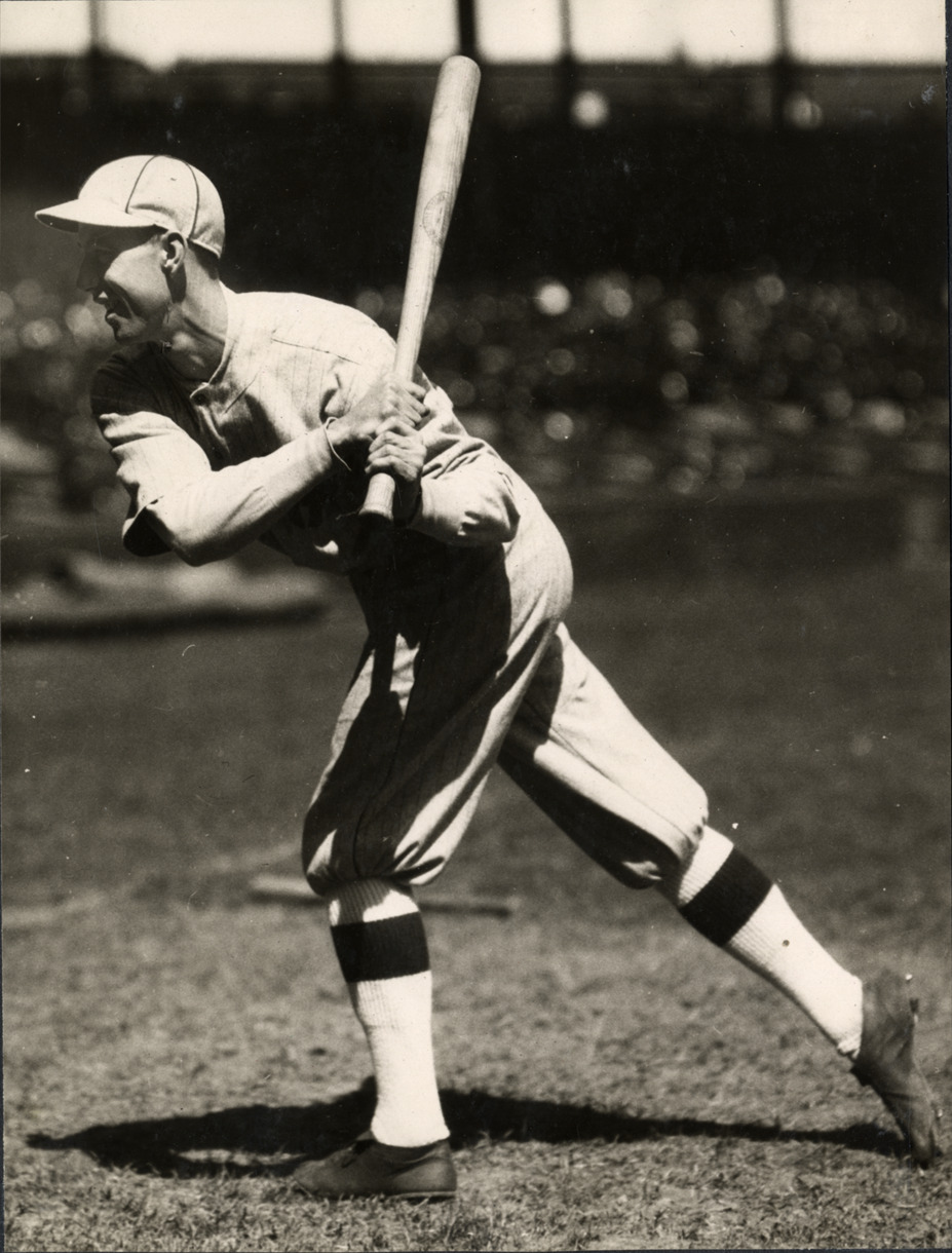 Portrait of Joe Dugan, baseball player for the New York Yankees, swinging a baseball bat. Typed on label: "Joseph A. Dugan, Yankees, 1926."