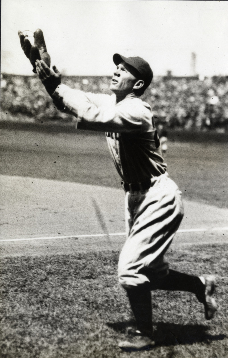 Portrait of Cedric Durst, baseball player for the New York Yankees, reaching for a fly ball. Typed on label: "Credic Durst [sic], Yankees, 1927."