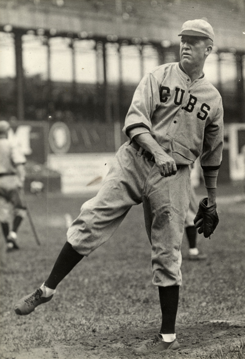 Portrait of pitcher Grover Cleveland 'Pete' Alexander, wearing a Chicago Cubs uniform. Typed on label: "Grover C. Alexander, Cardinals, 1928." Dates on label reflect affiliation with St. Louis Cardinals.