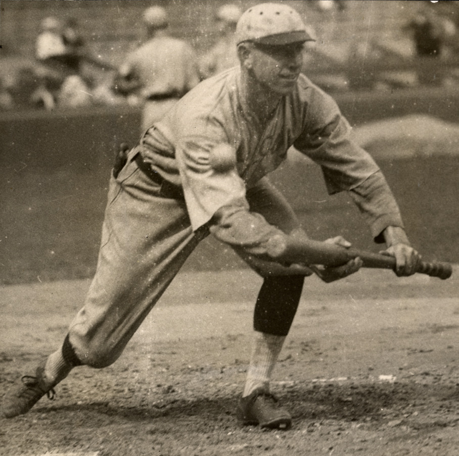 Portrait of Billy Southworth, baseball player for the St. Louis Cardinals, bunting a baseball. Typed on label: "Wm. Southworth, Cardinals, 1928."