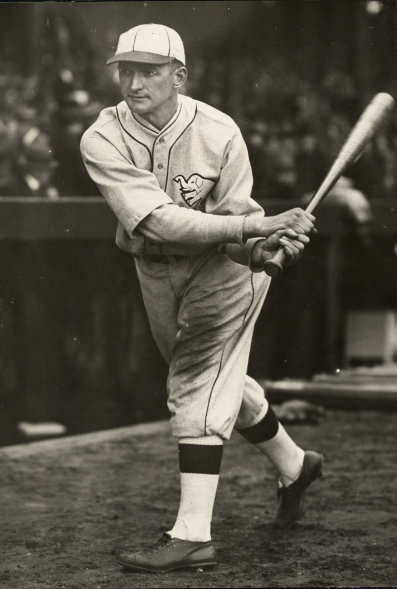 Portrait of Joe Boley, baseball player for the Philadelphia Athletics, swinging a baseball bat. Typed on label: "John P. Boley, Athletics, 1929."
