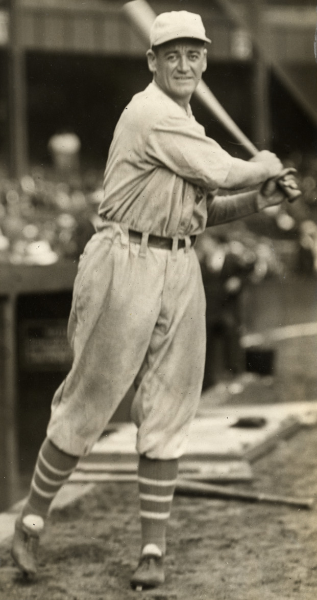 Portrait of George Burns, baseball player for the Philadelphia Athletics, swinging a baseball bat. Typed on label: "George Burns, Athletics, 1929."