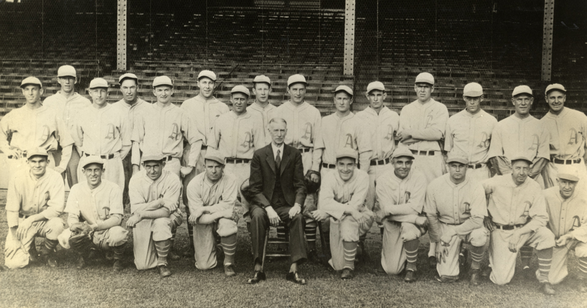 Group portrait of 1930 Philadelphia Athletics, posing in front of grandstand. Typed on label: "Philadelphia Athletics World Champions, 1930. Philadelphia Athletics World Champions, 1930. Standing, left to right, McNair, Grove, Bishop, Haas, Boley, Walberg, Schang, C. Perkins, Moore, Summa, Williams, Earnshaw, Mahaffey, Quinn and Rommel. Seated, Higgins, Perkins, Cochrane, Dyke, mngr. Connie Mack, Simmons, Miller, Foxx and Eddie Collins and Kid Gleason, coaches."