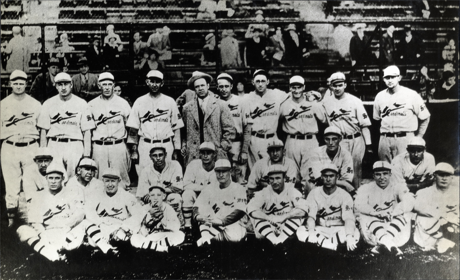 Group portrait of 1930 St. Louis Cardinals. Typed on label: "St. Louis Cardinals, National League champions, 1930. Standing, left to right, Lindsey, Bell, Johnson, Haines, Grimes, Bottomley, Hafey, Fisher, Wilson, Puccinelli. Middle row, Grabowski, Hallahan, Mancuso, Orsatti, Frisch, Gelbert and Blades. Front row, Watkins, Wares, the mascot, mngr. Charles Street, High, Adams, Douthit and Smith."