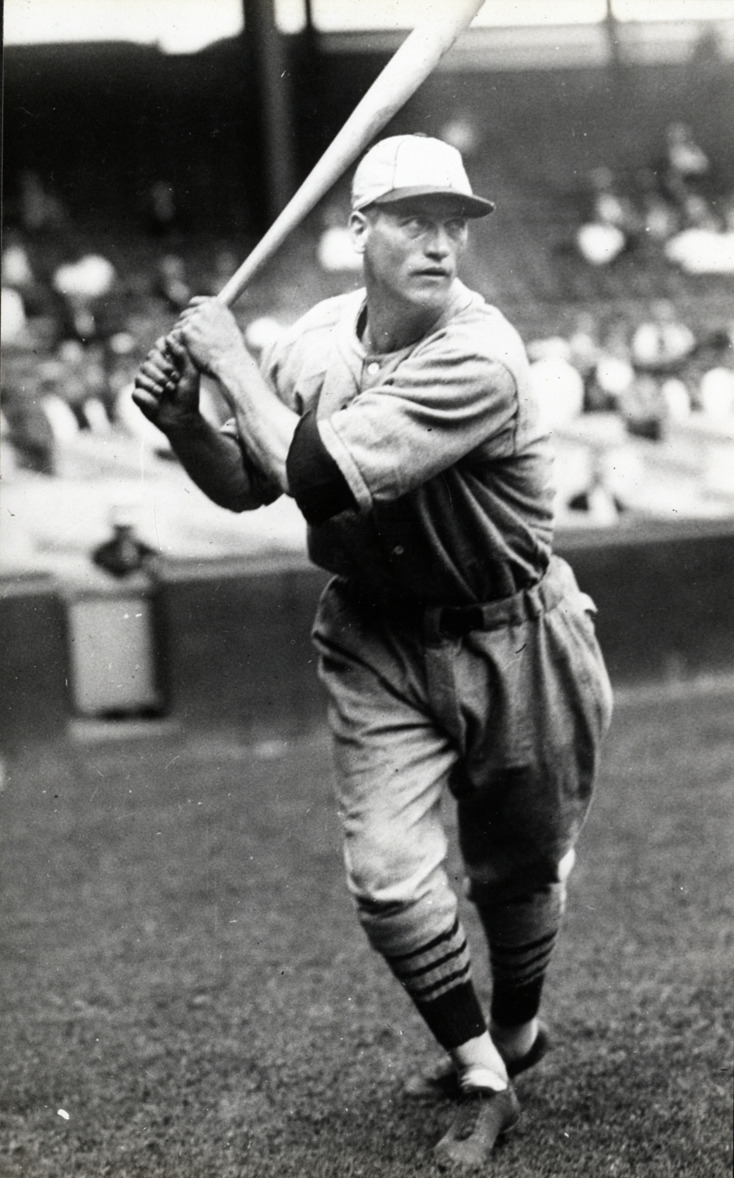 Portrait of Showboat Fisher, baseball player for the St. Louis Cardinals, swinging a baseball bat. Typed on label: "George A. Fisher, Cardinals, 1930."