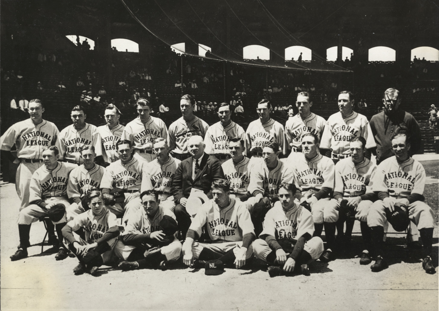 Group portrait of National League baseball players participating in first All-Star Game in 1933. Grandstand in background. Typed on label: "Stars from the National League teams. Seated on ground, left to right: batboy; Martin, St. Louis; Warneke, Chicago; Cuccinello, Brooklyn. Seated on chairs, left to right: Hallahan, St. Louis; Bartell, Philadelphia; Terry, New York; Bill McKechnie, Boston; John McGraw; Carey, Brooklyn; Hafey, Cincinnati; Klein, Philadelphia; O'Doul, New York; Berger, Boston. Standing, left to right: Hartnett, Chicago; Wilson, St. Louis; Frisch, St. Louis; Hubbell, New York; Walker, New York; P. Waner, Pittsburgh; English, Chicago; Schumacker [sic], New York, and Traynor, Pittsburgh."