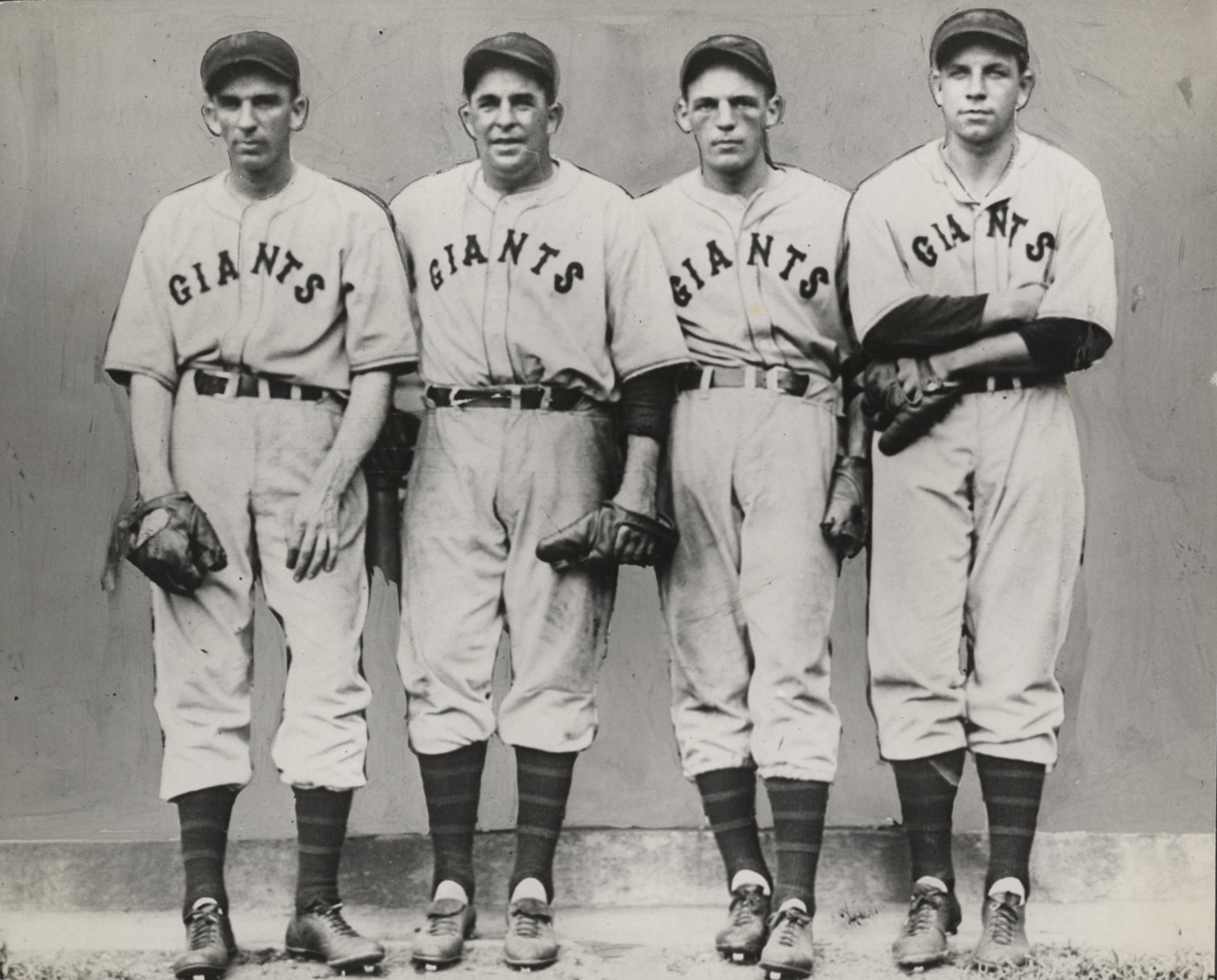 Favorite this☆ 1933 New York Giants pitching staff Description: Group portrait of 1933 New York Giants pitching staff. Typed on label: "Giant [sic] pitching staff 1933, left to right, Hubbell, Fitzsimmons, Schumacher and Parmalee [sic]." Details Resource ID: hr004729 Subject: Fitzsimmons, Freddie (Frederick Landis), 1901-1979 Hubbell, Carl (Carl Owen), 1903-1988 Schumacher, Hal (Harold Henry), 1910-1993 Parmelee, Roy (Le Roy Earl), 1907-1981 Pitchers (Baseball)--New York (State)--New York New York Giants (Baseball team) World Series (Baseball) (1933) Photographic prints Date Issued: 1933 Format: 1 photographic print mounted on stock ; image 7.25 x 9 in. Member of: Ernie Harwell Sports Collection Filing Location: Oversize SB/Photographs-World Series, 1932-1934 Note (Content): Photograph from scrapbook of World Series, 1932-1934 Rights: Physical rights are retained by DPL. Copyright is retained in accordance with U.S. copyright laws.