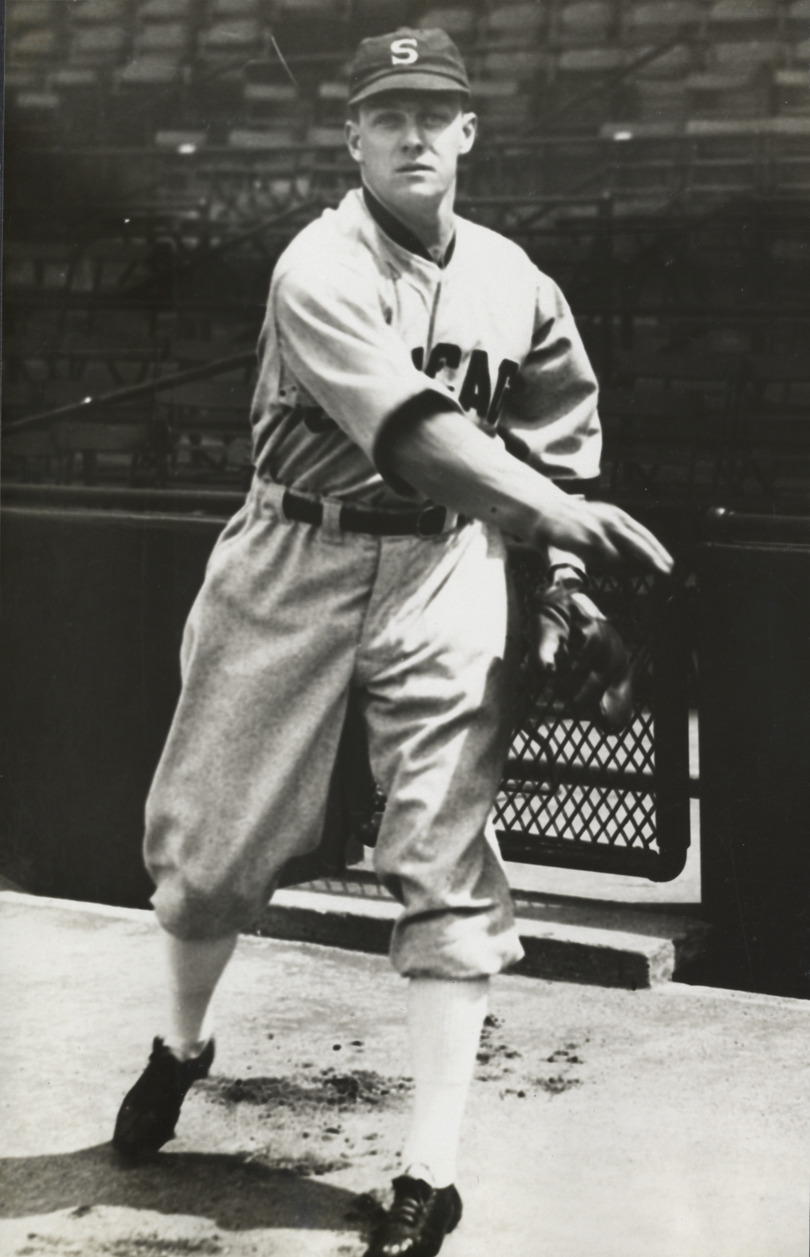 Portrait of pitcher Tommy Thomas, wearing a Chicago White Sox uniform. Typed on label: "Alphonse T. Thomas, Washington, 1933." Dates on label reflect affiliation with Washington Senators.